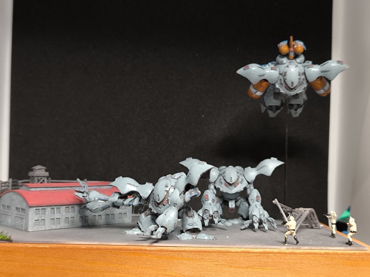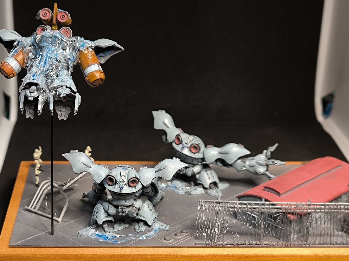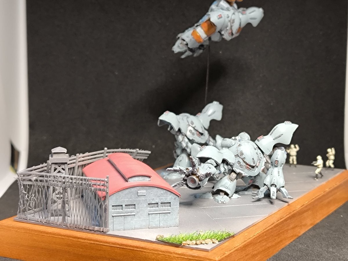 \完成にするよ~/ 複数個の作成・改造とジオラマで約1ヶ月間の作成でした。 塗装はアクリジョン筆塗り🎨 初ジオラマで外周のフェンス、基地の地表面、機体につけた水表現が難しくて何回か作りました😇 #スペリオルディファイン #ハイゴッグ