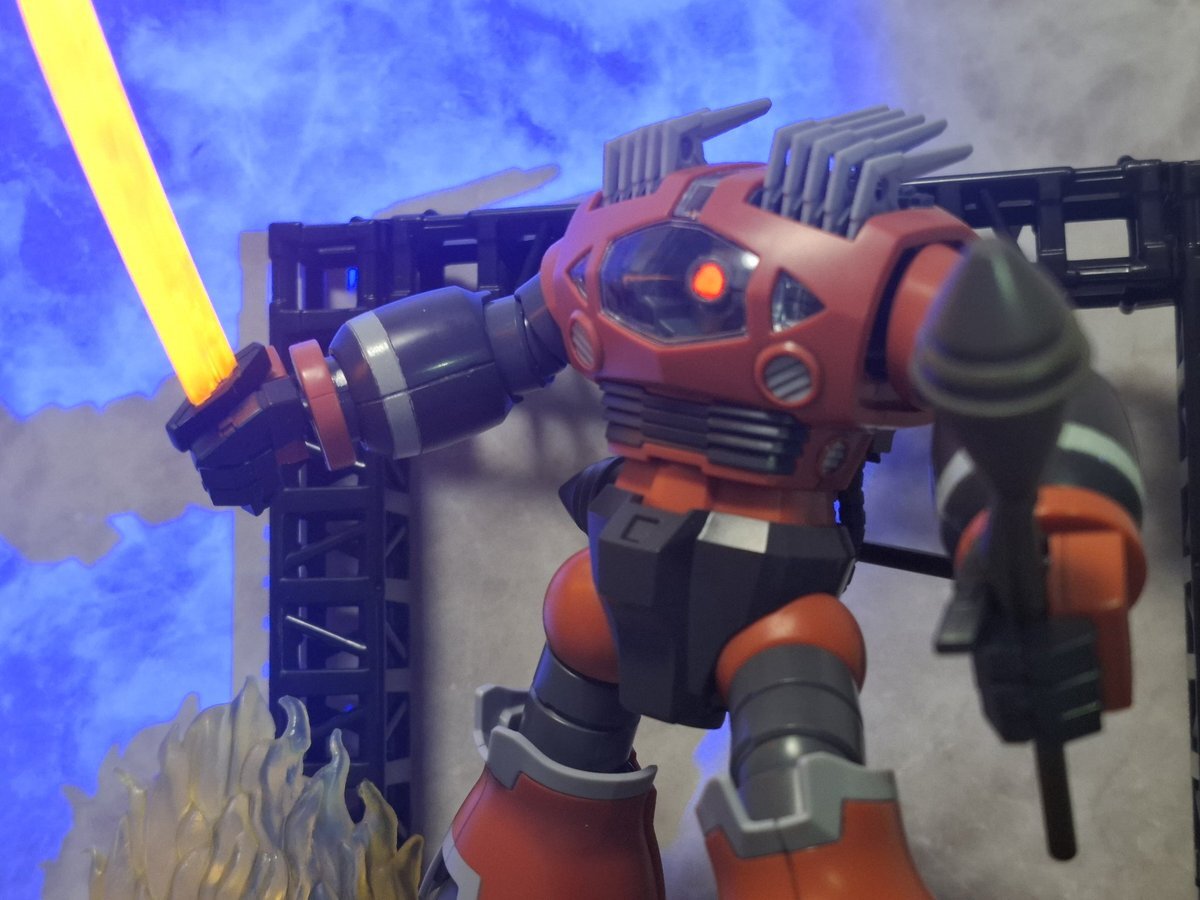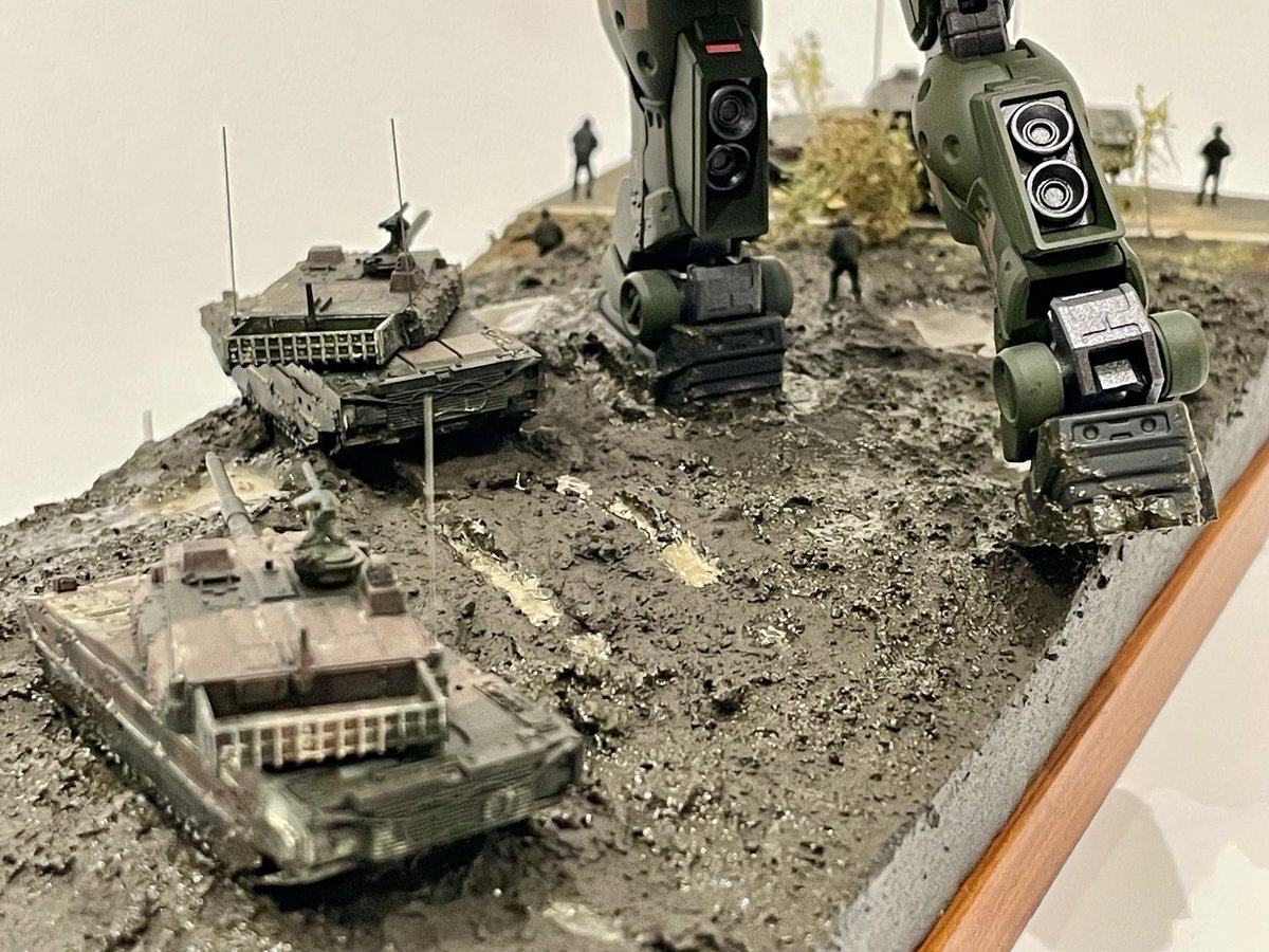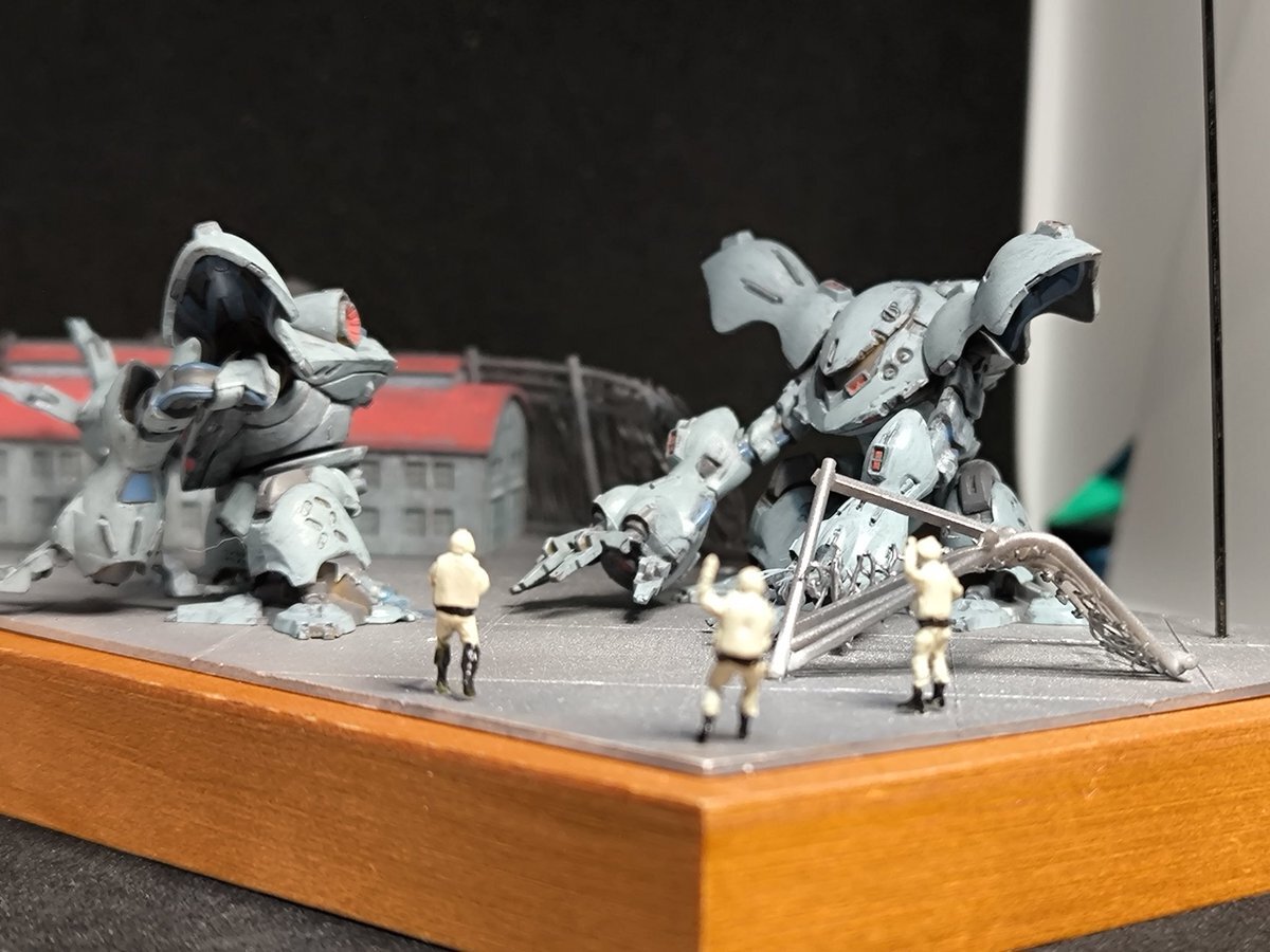 \完成にするよ~/ 複数個の作成・改造とジオラマで約1ヶ月間の作成でした。 塗装はアクリジョン筆塗り🎨 初ジオラマで外周のフェンス、基地の地表面、機体につけた水表現が難しくて何回か作りました😇 #スペリオルディファイン #ハイゴッグ
