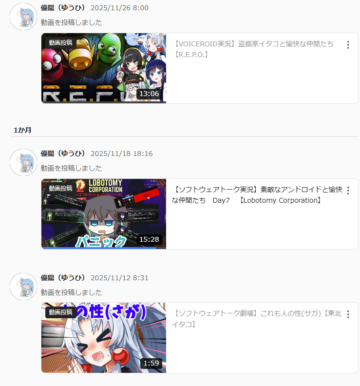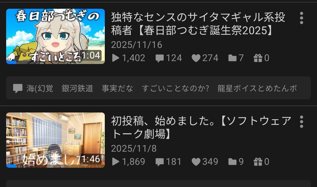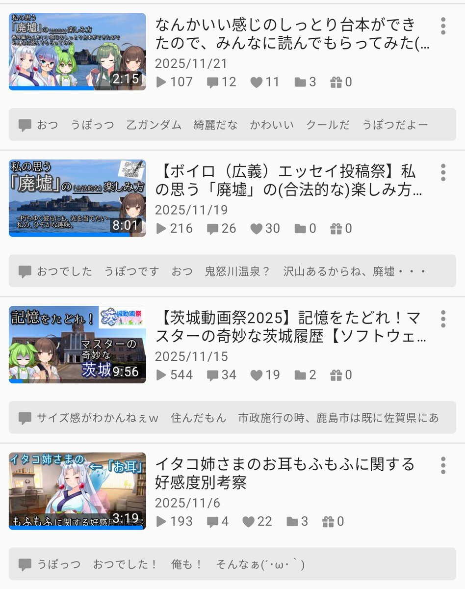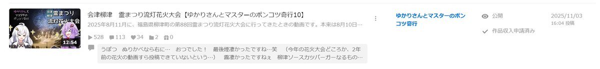 #今月投稿した動画を晒そう じゃあ動画を作ってたのかというとそういうわけでもなくて、ニコニコ4本つべ3本 全く同じ内容の「茨城履歴(つべ版)」、ほぼ切り抜きの「しっとり台本」を除くと、実質的な投稿本数は5本 休みの日何してたんでしょうね本当に pic.x.com/W7biLwRnEd x.com/Kasumida3114/s…