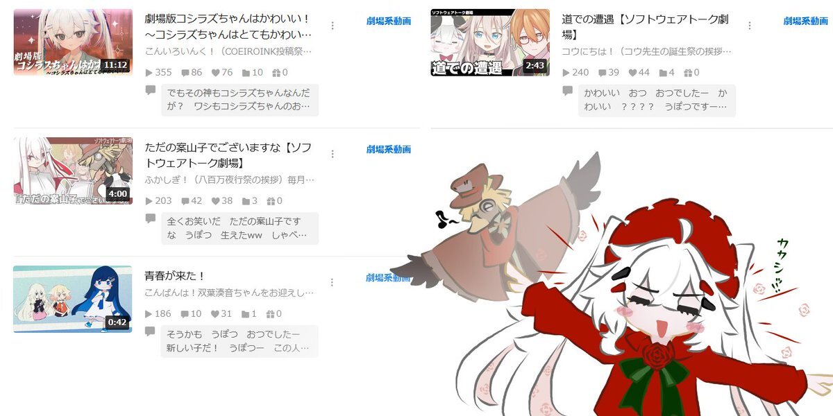 #今月投稿した動画を晒そう 今月は4本! うちコシラズちゃん登場回数は3本です!(報告義務) 今月は全部劇場動画! なぜかシリーズ化したコウ先生の動画は…今後も続くかは謎です! COEIROINK投稿祭も無事参加出来てよかった!ガンバッタ‼ 今回のらくがきはただの案山子と赤薔薇ちゃんです! pic.x.com/JqUzINThOa