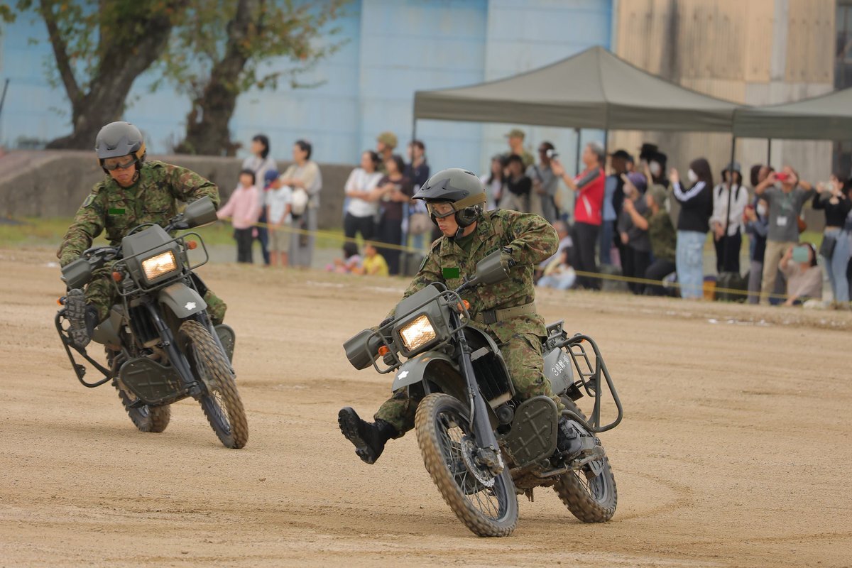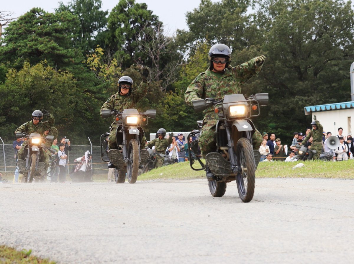 記念行事の思い出、バイク編です!当日は一糸乱れぬ動きで会場を縦横無尽に走り回っておりました。皆様からの歓声も聞こえていたようです! #記念行事 #今津駐屯地記念行事 #今津駐屯地記念行事 #CAMPIMAZU pic.x.com/AWzxmDNGGS