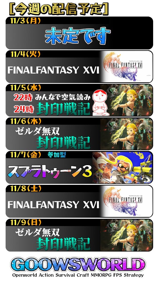 おはようございます🐸 今週も始まりましたね🌌 今週はいよいよゼルダ無双をプレイ出来る🔥 楽しみ過ぎる☺ 今週の予定を作りましたので ぜひ遊びに来てください🌎 #今週の予定 #FF16 #ゼルダ無双封印戦記 #スプラトゥーン3 #みんなで空気読み pic.x.com/26czHJFl22