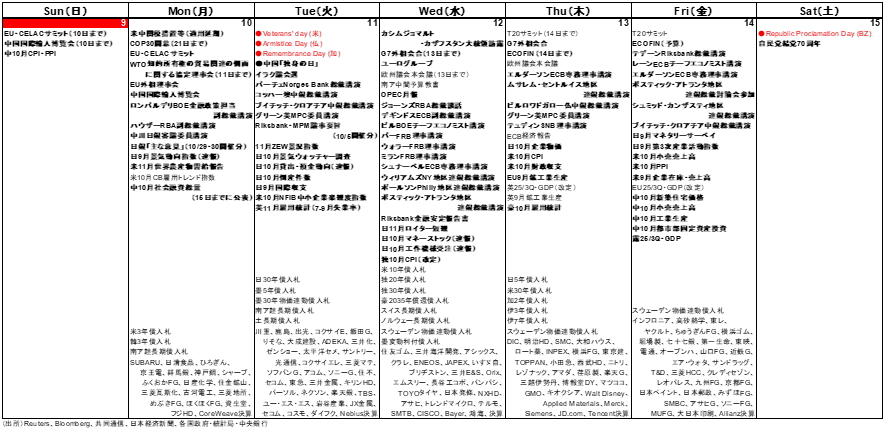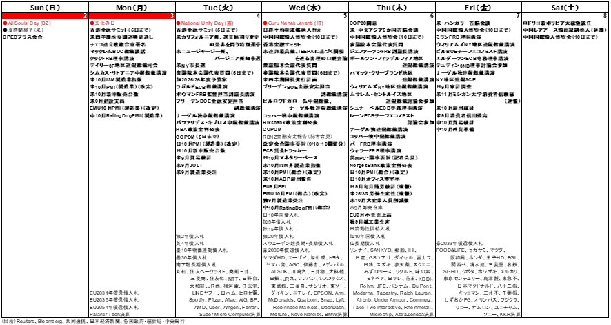#今週の予定。 日本は三連休も内外でイベントが目白押し。 とくに米国では連邦政府の閉鎖が続くなか、州や市での選挙、要人往来、国債発行計画の公表などが相次ぐ。 企業の決算発表もあり、引き続き波乱含み。 pic.x.com/spM2IqI5wd