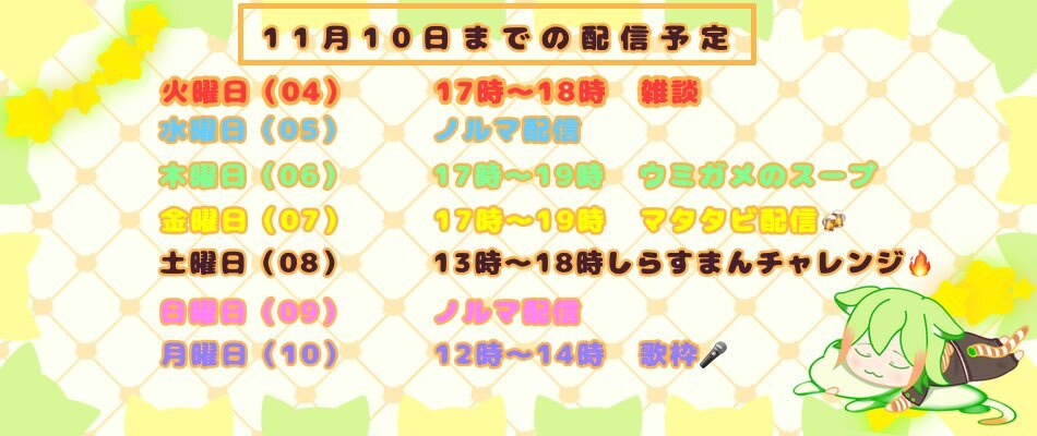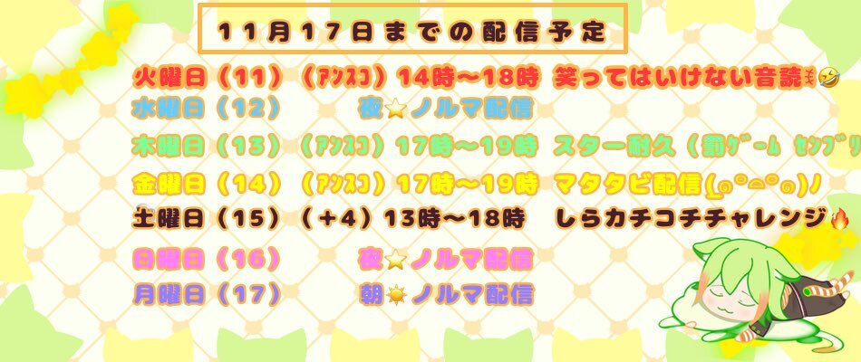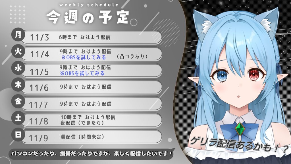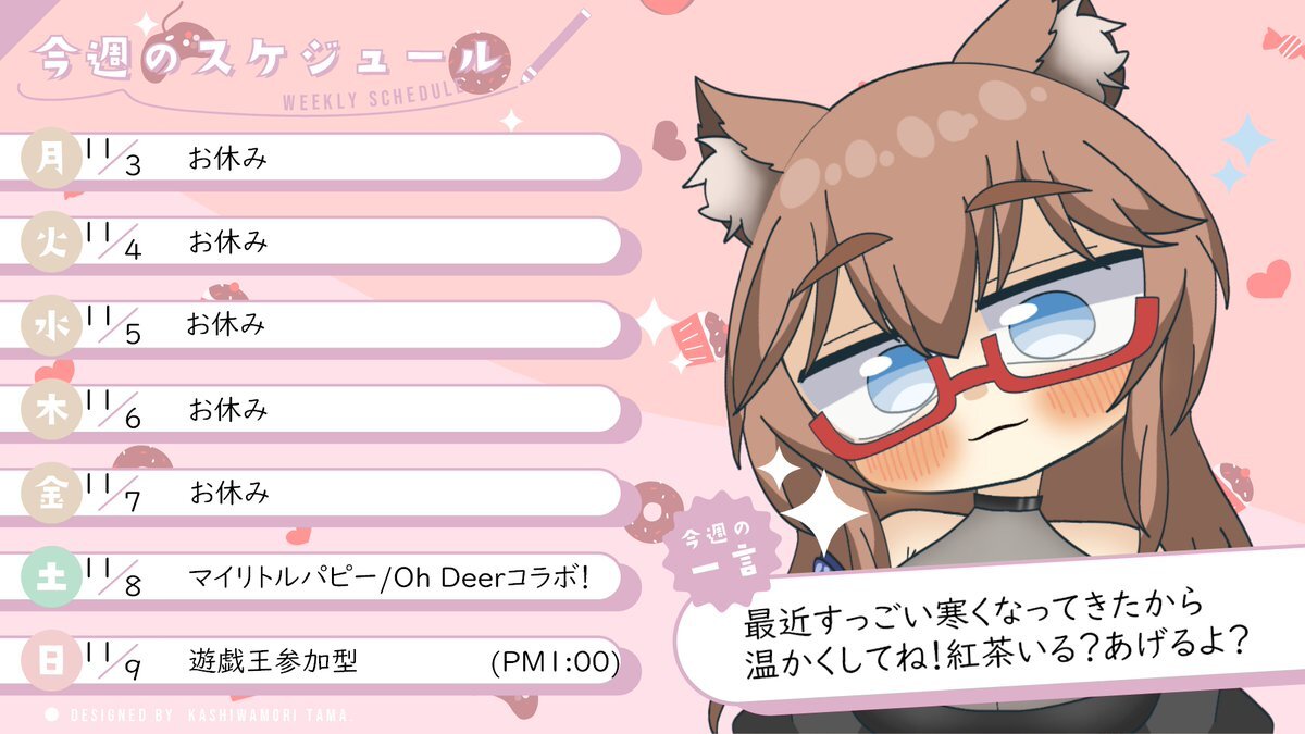 遅くなりました💦 11月3日〜11月9日までの予定です! 途中、変更あるかも!? コラボなどもできたら嬉しいです*.(๓´͈ ˘ `͈๓).* #今週の予定 #TikTok配信 #Vtuber #livewith所属 #来てくださると嬉しいです #よろしくお願いします #拡散希望RTご協力お願い致します pic.x.com/yB0tGL6uXm
