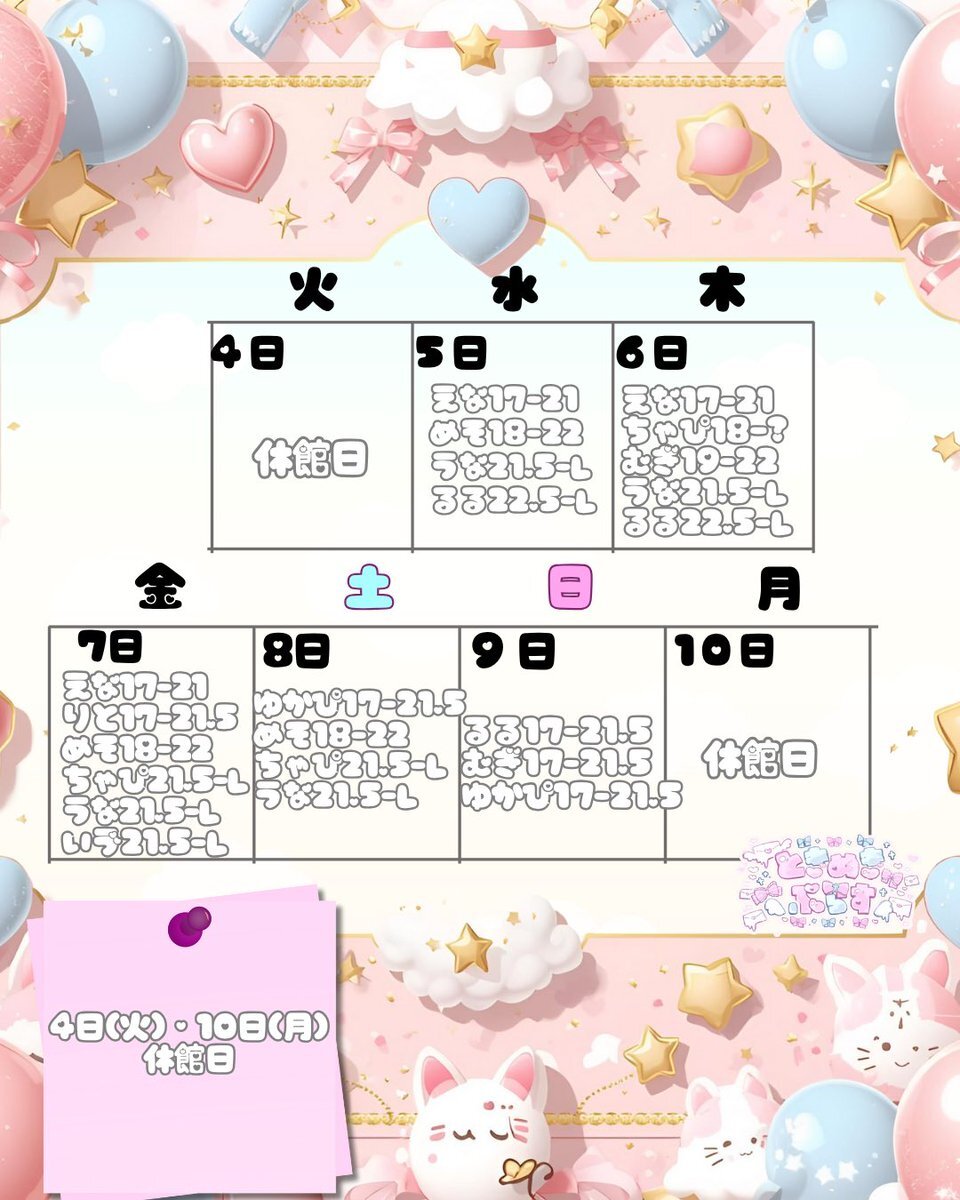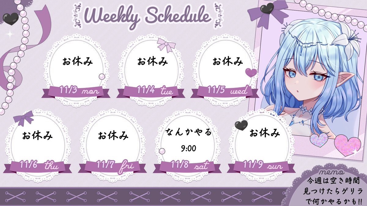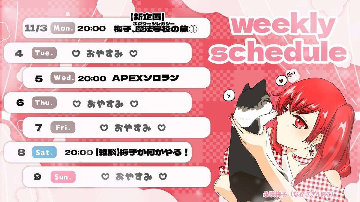 おはうめ~🌸 ちょっと遅刻しちゃったけど 今週の週間スケジュールはこちらっ🗓✨️ 土曜日は基本“雑談”予定だけど、 お供にチルめなゲーム🎮かお絵描き🎨もしたい気分… え、両方やっちゃう??🤣 今日もみんな生きててえらいっ💮 1日元気に生きていこ~っ☀️ #おはよう人類 #今週の予定 #配信予定 pic.x.com/U2GTyExJPp