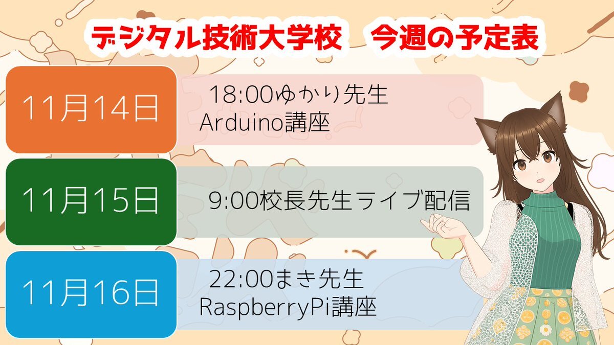 お知らせでーす。 デジタル技術大学校の今週の予定表を作りました。 今週も楽しんでいっちゃいましょう! #デジタル技術大学校 #今週の予定 #ゆかり先生 #まき先生 #みやりん校長 pic.x.com/V8E9cQJRbc