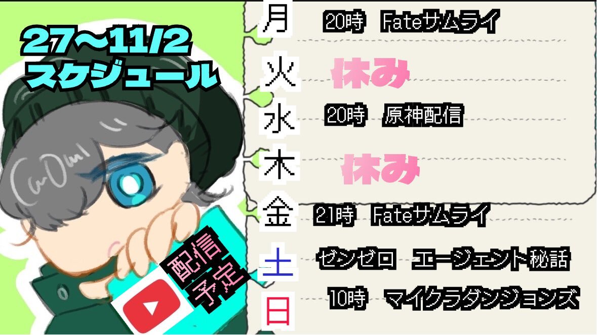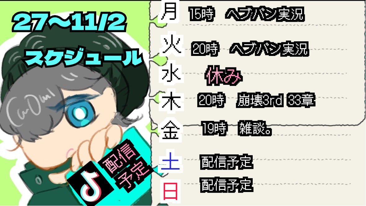 今週の予定少し修正しました ヘブバンやばすぎ この、気持ちのまま 土曜日までは 無理じゃ YouTube金曜日枠にFateサムライレムラントを入れていく予定です。 #今週の予定 #配信者 pic.x.com/QEBHVI9td4