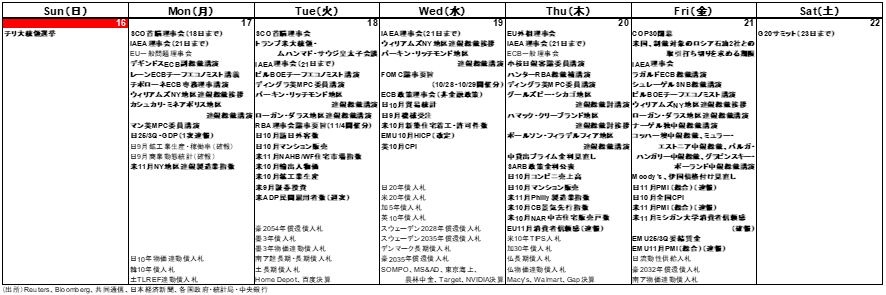 #今週の予定。 米連邦政府の一部閉鎖が長期化し、影響が顕在化。 国際会議ではウクライナ戦争や経済安全保障が焦点に。 中銀メンバーの露出も多く、「次の一手」を巡る思惑が交錯しそう。 pic.x.com/hUCTgBu366