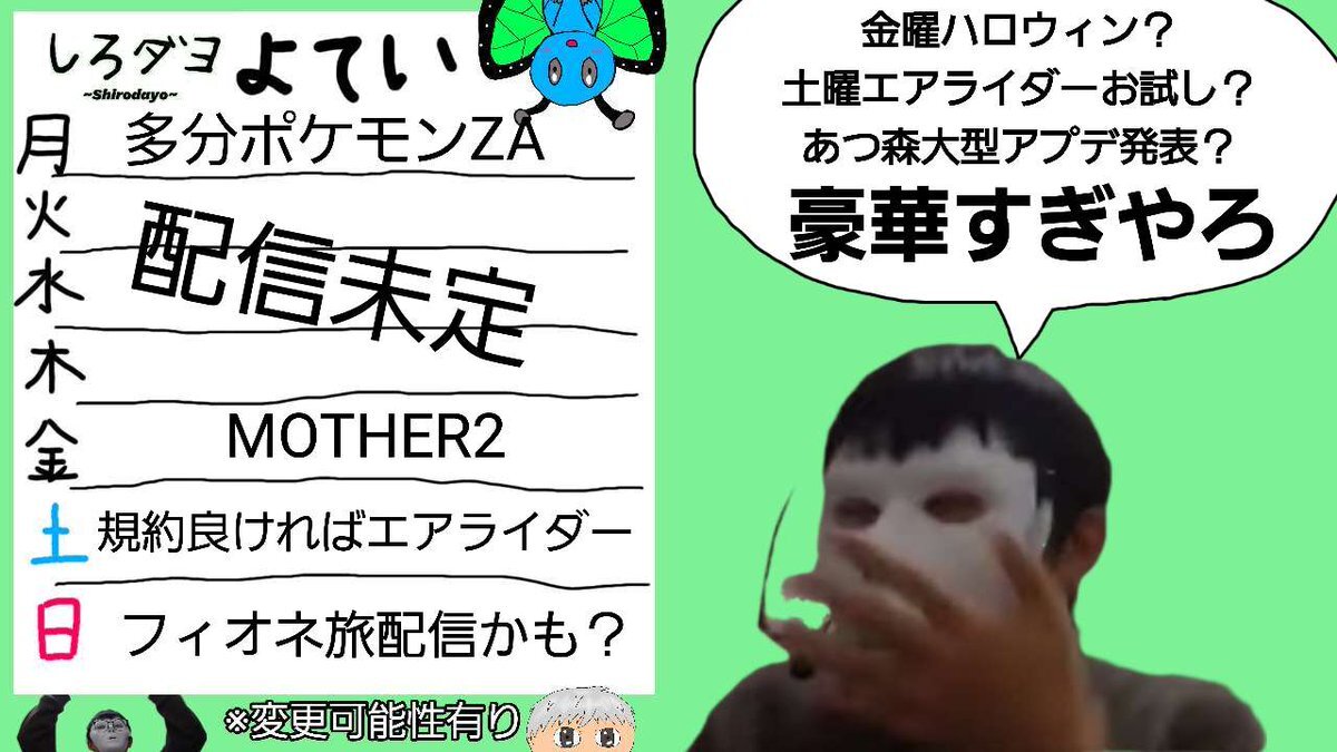 #配信予定 #今週の予定 こんちゃ!しろダヨですね。 朝投稿しよう思ったけど普通に今日月曜日だったこと忘れてた。 そして月曜日僕はMOTHERをやると思っていた。 まあ、ZA早めに進めたいし今日もZA進めます。 エアライダーも配信出来るんだったらやりたいよね! さあ宴と行こうか! 今週も頑張ろー! pic.x.com/vX39Xmv6tJ