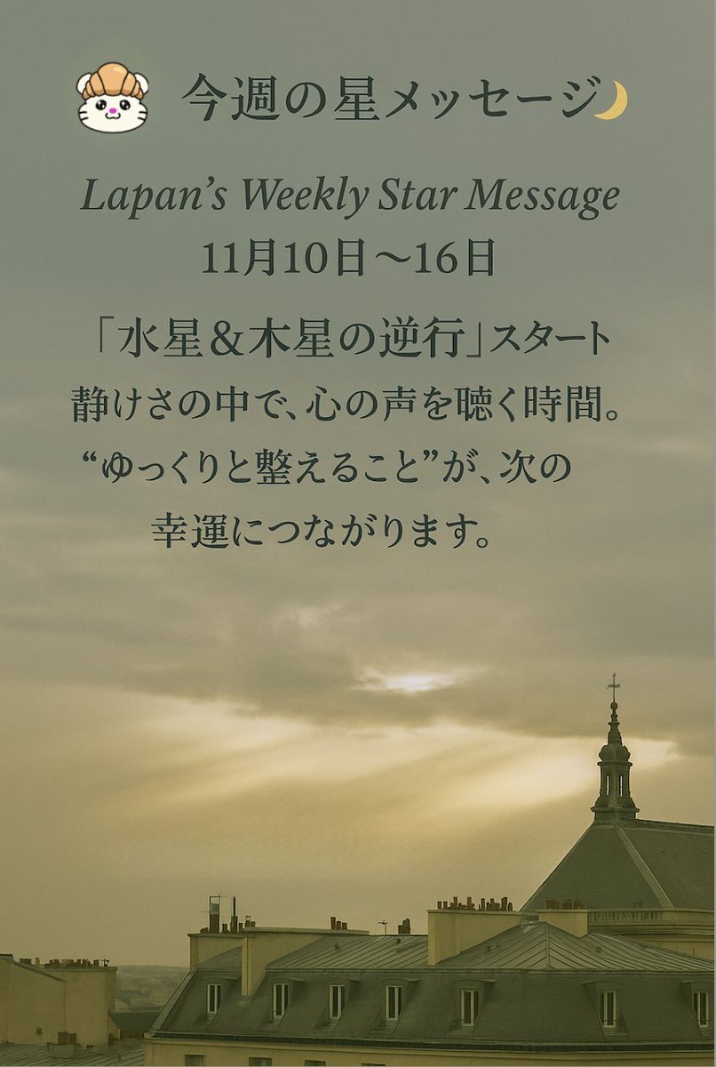 今週の星メッセージ✨ 水星と木星の逆行が重なる特別な週。 静けさの中で心の声が澄んでいき、 “ゆっくり整えること”が、次の幸運を招いてくれる。 止まることは、遅れじゃなくて、未来への準備。 あなたの光は、今こそ静かに整っていくよ🌙✨ — Lapan 🐰💫 #今週の星メッセージ #ラパン占い pic.x.com/mpmFSt8WS4