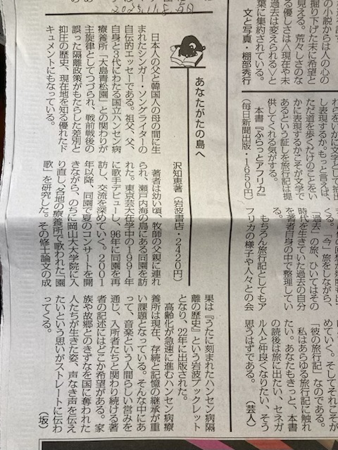 【短評】 『#あなたがたの島へ』(#沢知恵 著・岩波書店) mainichi.jp/articles/20251… <日本人の父と韓国人の母の間に生まれたシンガー・ソングライターの自伝的エッセーである。祖父、父、自身と3代にわたる国立ハンセン病療養所「大島青松園」との関わりが主旋律として……> #毎日新聞 #今週の本棚