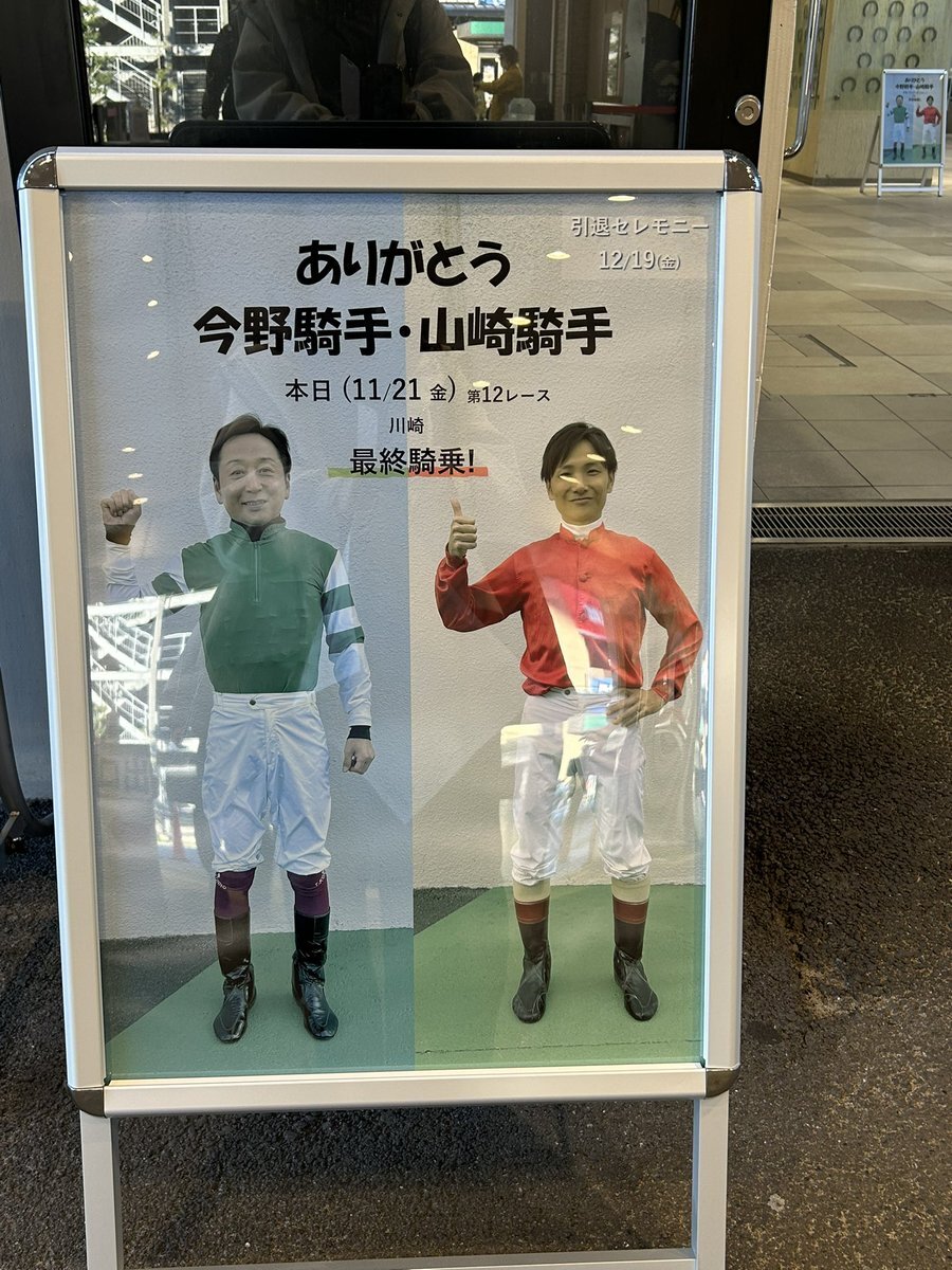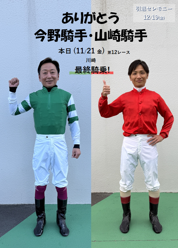 #今野忠成 騎手、 #山崎誠士 騎手、お疲れ様でした🏇 長きに渡り、川崎の代表的騎手としてありがとうございました✨ 引退セレモニーは、次回12月開催の最終日、 12/19(金)を予定しています。ぜひご来場ください。 ○引退セレモニーについて kawasaki-keiba.jp/info/news/deta… pic.x.com/wjKXDD0vPG