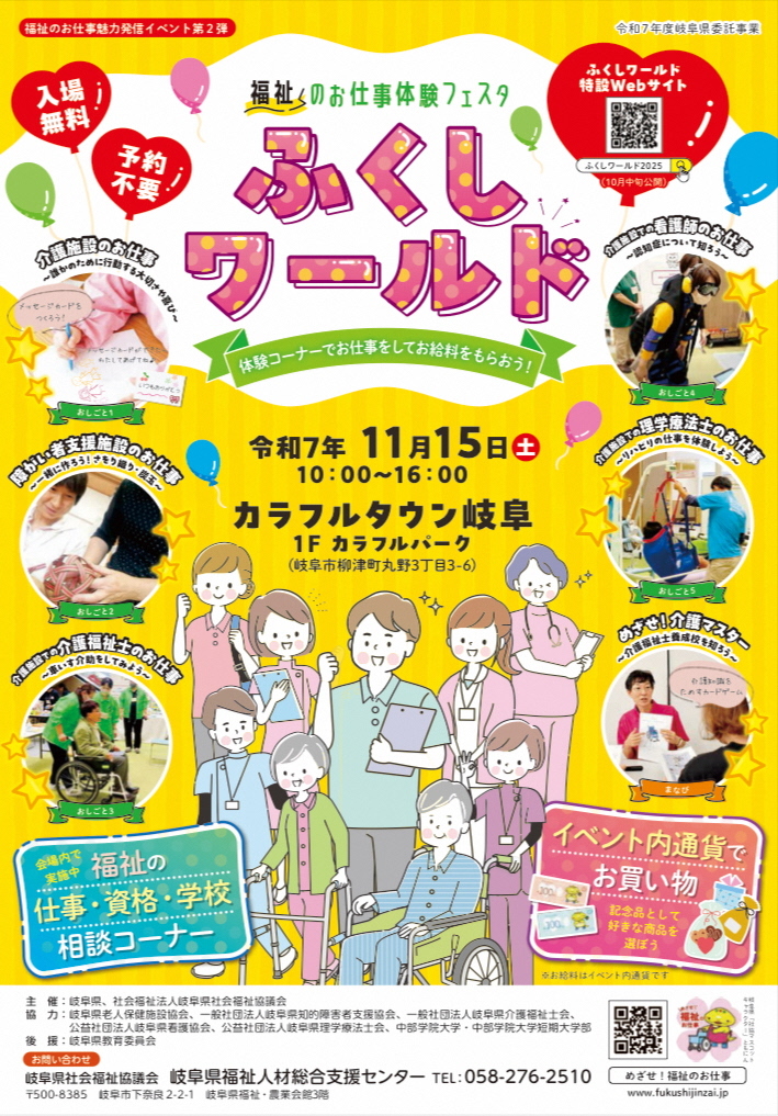 #岐阜県 では、 #介護の日 (11月11日)に合わせて、「#福祉のお仕事体験フェスタ ふくしワールド」を開催します! 介護施設の #お仕事体験 等子どもから大人まで、楽しくご参加いただけます✨(入場無料、予約不要) 【日時】令和7年11月15日(土) 10時~16時 pref.gifu.lg.jp/site/pressrele… pic.x.com/l2vP85LQXd