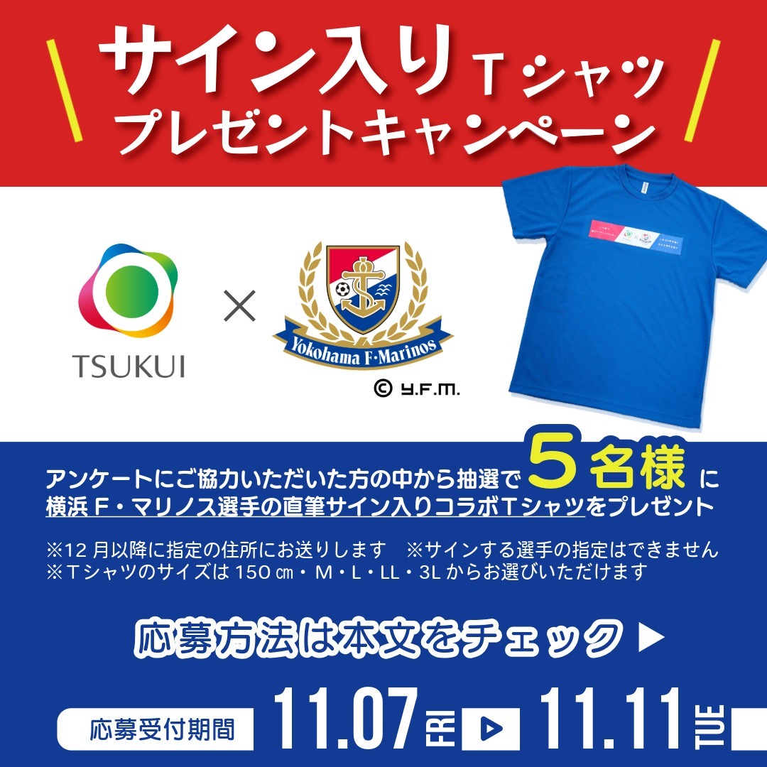 11月11日は「介護の日」♿ この日にちなみ、介護に関する意識調査を実施中! 抽選で5名様にF・マリノス選手のサイン入りコラボTシャツをプレゼント🎁 ▶参加方法 ①@Official_TSUKUIをフォロー ②@Official_TSUKUIを含めてこの投稿をリポスト ③意識調査に回答☞lnky.jp/nNX6ajm #fmarinos