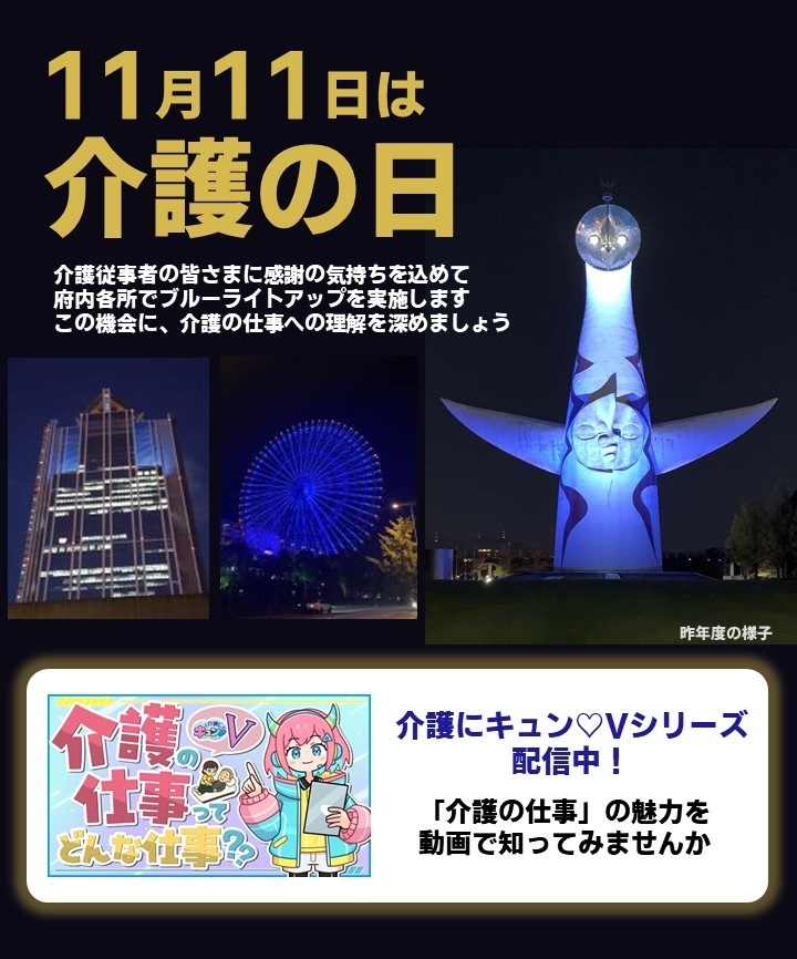 \介護の魅力を発見!/ 本日11月11日は「介護の日」。介護従事者の方への感謝の気持ちを込めて府内各所でブルーライトアップを実施するで! さらに、介護の仕事を学べる動画も配信中♪ この機会に、生活に身近な「介護」の魅力を発見してみいひん? pref.osaka.lg.jp/o090040/houjin…