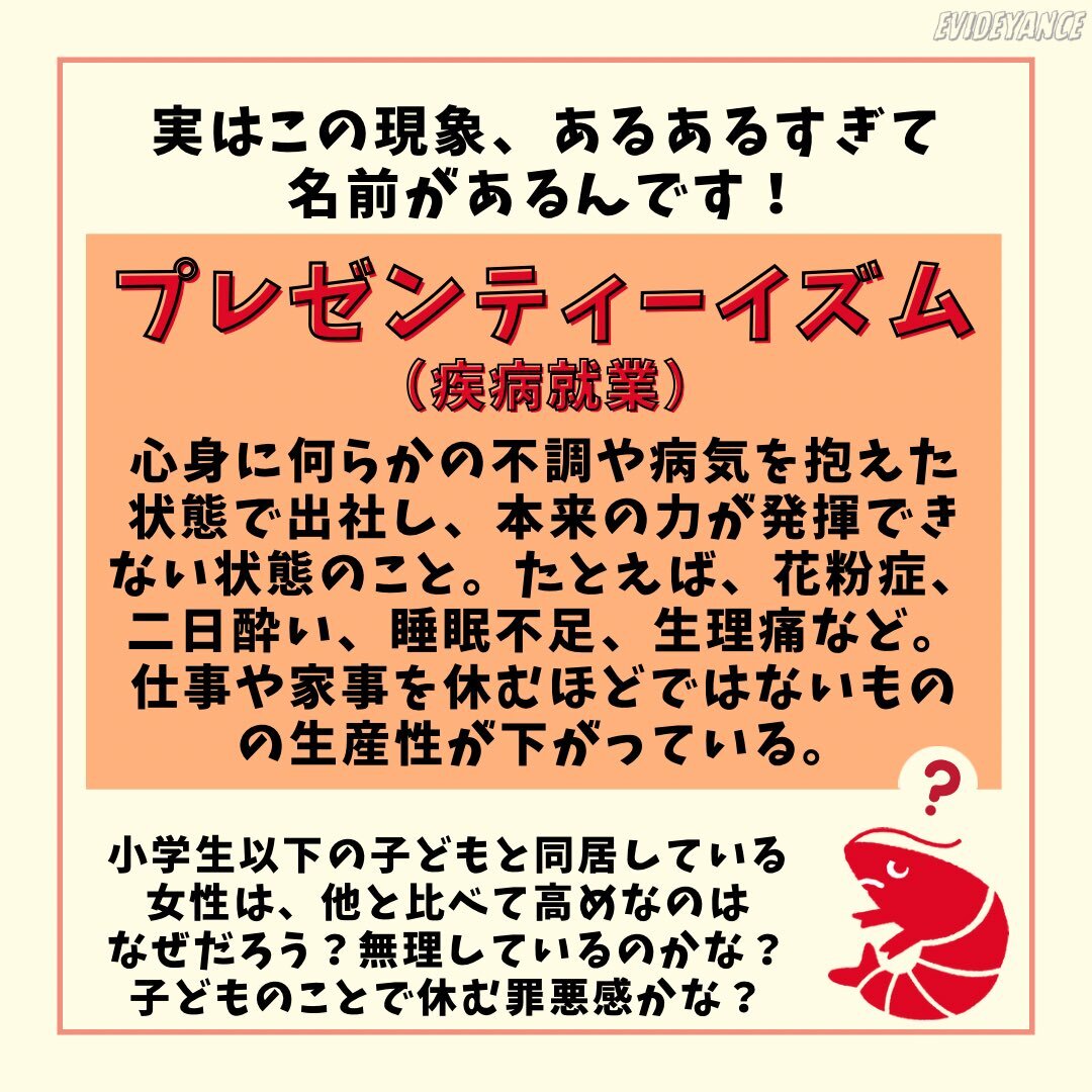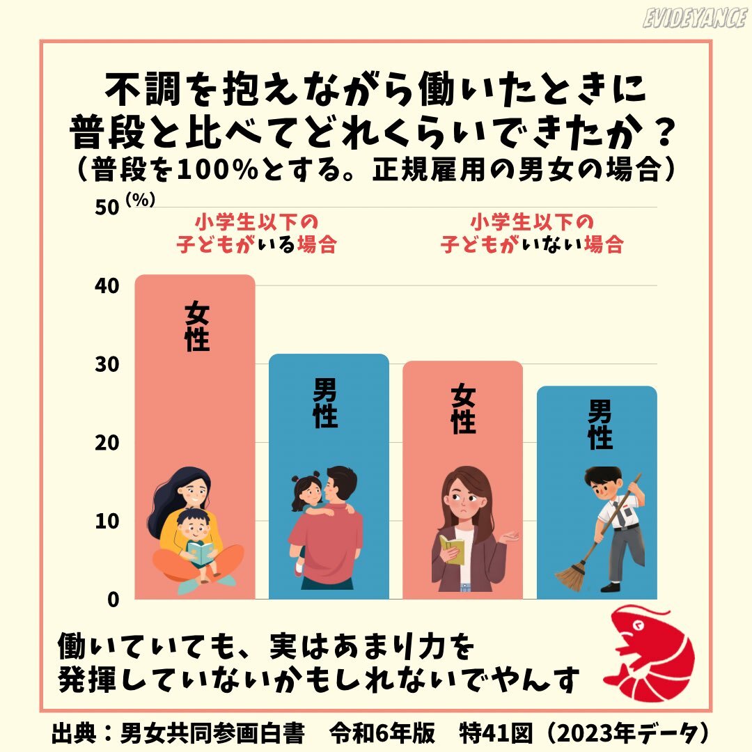 いつも絶好調な人はいないって分かっちゃーいるけど、でも、調子が出ないまま無理して仕事するのってしんどいよね・・・。小学生以下の子どもと同居している女性は特に無理してないかな? #エビでやんす #プレゼンティーイズム #疾病就業 #仕事したくない pic.x.com/dbVTp7reg1