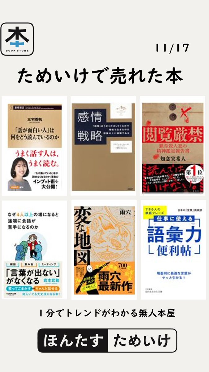 無人本屋 #ほんたす 🙂11月17日🍂🌤️ 「将棋の日」 📖昨日売れた本の紹介📖 #「話が面白い人」は何をどう読んでいるのか #感情戦略 #閲覧厳禁 猟奇殺人犯の精神鑑定報告書 #なぜ4人以上の場になると途端に会話が苦手になるのか #変な地図 #仕事に使える「語彙力」便利帖 pic.x.com/3vF5ihgCeM