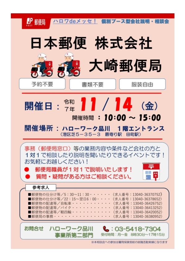 【11/14(金)10:00~15:00個別ブース型会社説明•相談会📢】日本郵便株式会社 大崎郵便局によるイベント🙌担当者と直接 お話しできます! ご参加お待ちしております! #仕分け #配達 #事務 pic.x.com/G8sFizvqrQ
