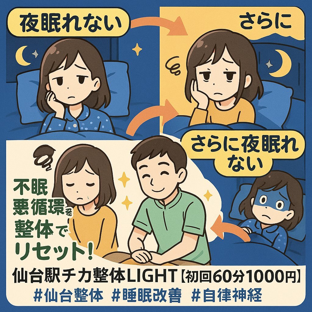 「夜眠れない」→「日中だるい」→「さらに夜眠れない」 不眠の悪循環を整体でリセット! 仙台駅チカ 整体LIGHT【初回60分1000円】 #仙台整体 #睡眠改善 #自律神経 pic.x.com/GCnrbZwHea