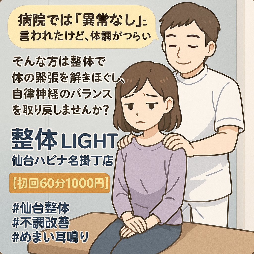 病院では「異常なし」と言われたけど、体調がつらい…。 そんな方は整体で体の緊張を解きほぐし、自律神経のバランスを取り戻しませんか? 整体LIGHT仙台ハピナ名掛丁店【初回60分1000円】 #仙台整体 #不調改善 #めまい耳鳴り pic.x.com/QYYXKNc6K2