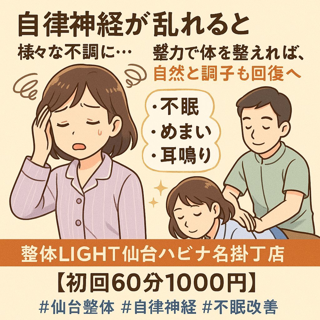 自律神経が乱れると「不眠」「めまい」「耳鳴り」など様々な不調に…。 整体で体を整えれば、自然と調子も回復へ向かいます。 整体LIGHT仙台ハピナ名掛丁店【初回60分1000円】 #仙台整体 #自律神経 #不眠改善 pic.x.com/nGxMjEECYO