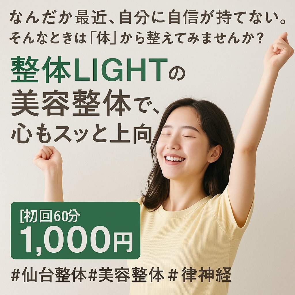 なんだか最近、自分に自信が持てない。 そんなときは「体」から整えてみませんか? 整体LIGHTの美容整体で、心もスッと上向く。 【初回60分1,000円】 #仙台整体 #美容整体 #自律神経 pic.x.com/yFQrypaEnV