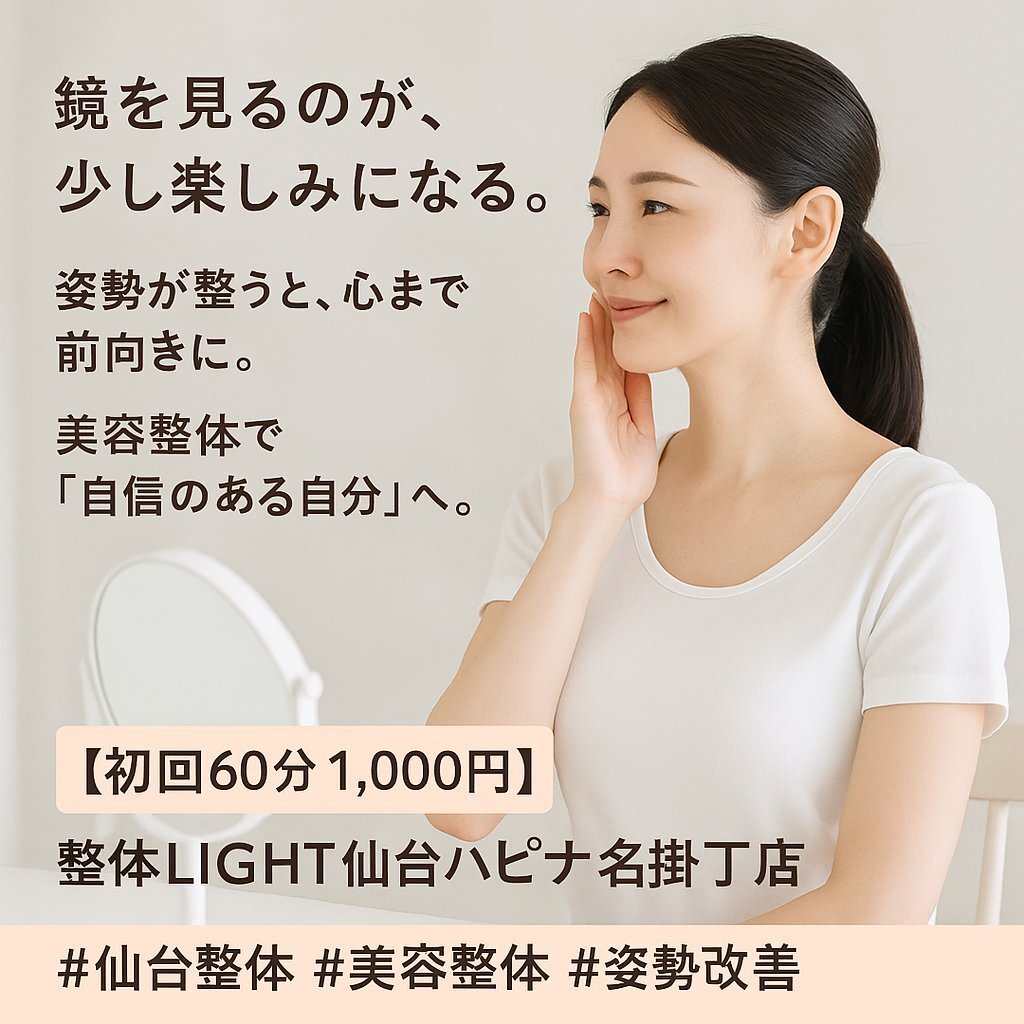 鏡を見るのが、少し楽しみになる。 姿勢が整うと、心まで前向きに。 美容整体で「自信のある自分」へ。 【初回60分1,000円】整体LIGHT仙台ハピナ名掛丁店 #仙台整体 #美容整体 #姿勢改善 pic.x.com/3EA4bvSUZK