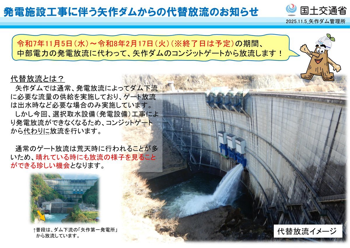 【お知らせ📢】 令和7年11月5日9時より、発電施設工事に伴い、#矢作ダム は #ゲート放流(#代替放流)を開始しました。 代替放流について、詳細は添付データをご覧ください。 ※先ほどの画像に誤りがあったため、再投稿しました。 #矢作川 #豊田市 #恵那市 #放流