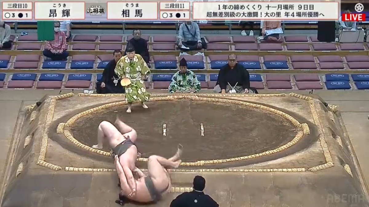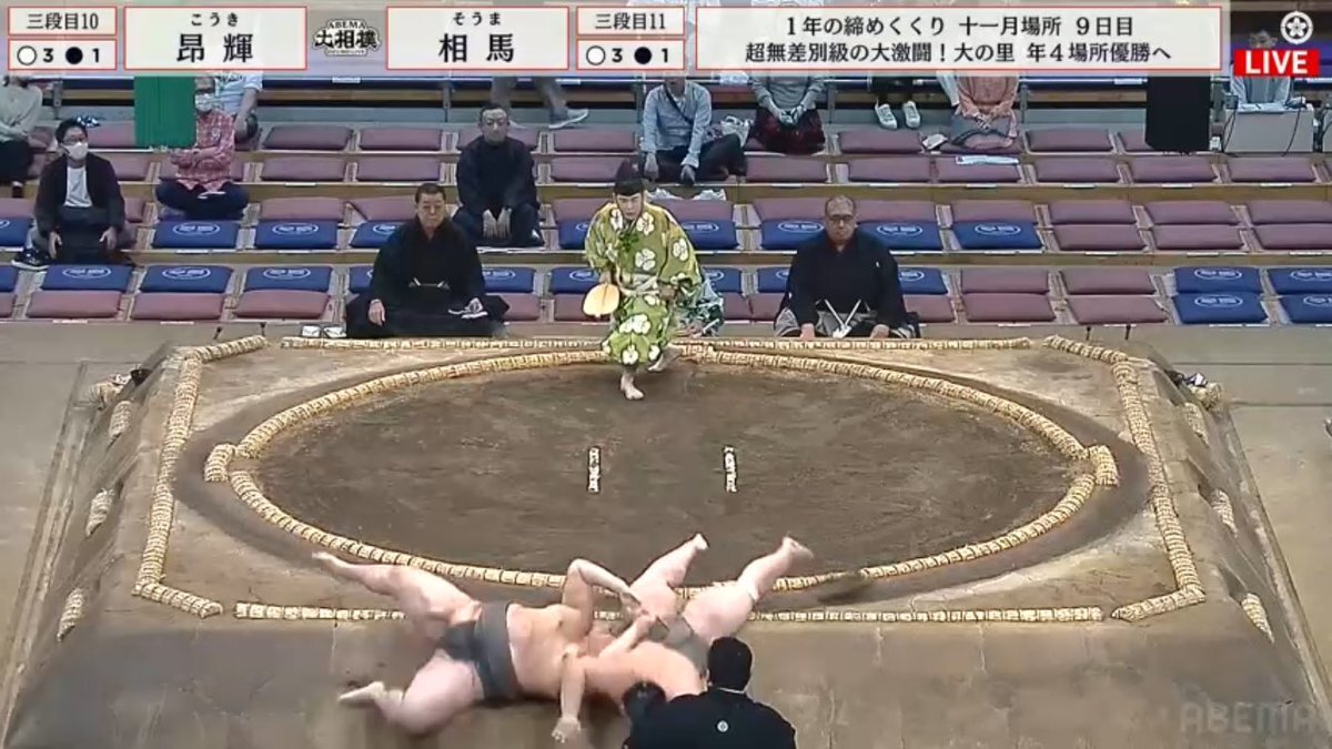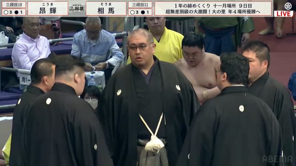 相馬さん白星🌟 二度の物言いの末勝ち越しっ! おめでとう!! 写真は 一度目の対戦→物言い(軍配は相馬、同体とみて取り直し)→二度目の対戦→物言い(軍配は相馬→軍配どおり勝ち) 親方の肩越しの相馬さんがちょっとかわいくてさ... #令和七年十一月場所九日目 pic.x.com/5bj97PP53b