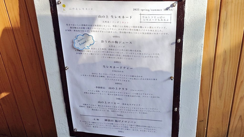 #令和7年11月8日 山の上レモネード 御岳山ケーブルカーの上の駅、御岳山駅の脇にある。有機食材、地元食材をふんだんに使ったレモネードカフェ。 揚げメロンパンにトッピングをしたものも看板商品。 ケーブルカー待ちに、山の上コーヒーを。酸味がすっときて、水のように後味がすっきり。 pic.x.com/DZeks2c9MX