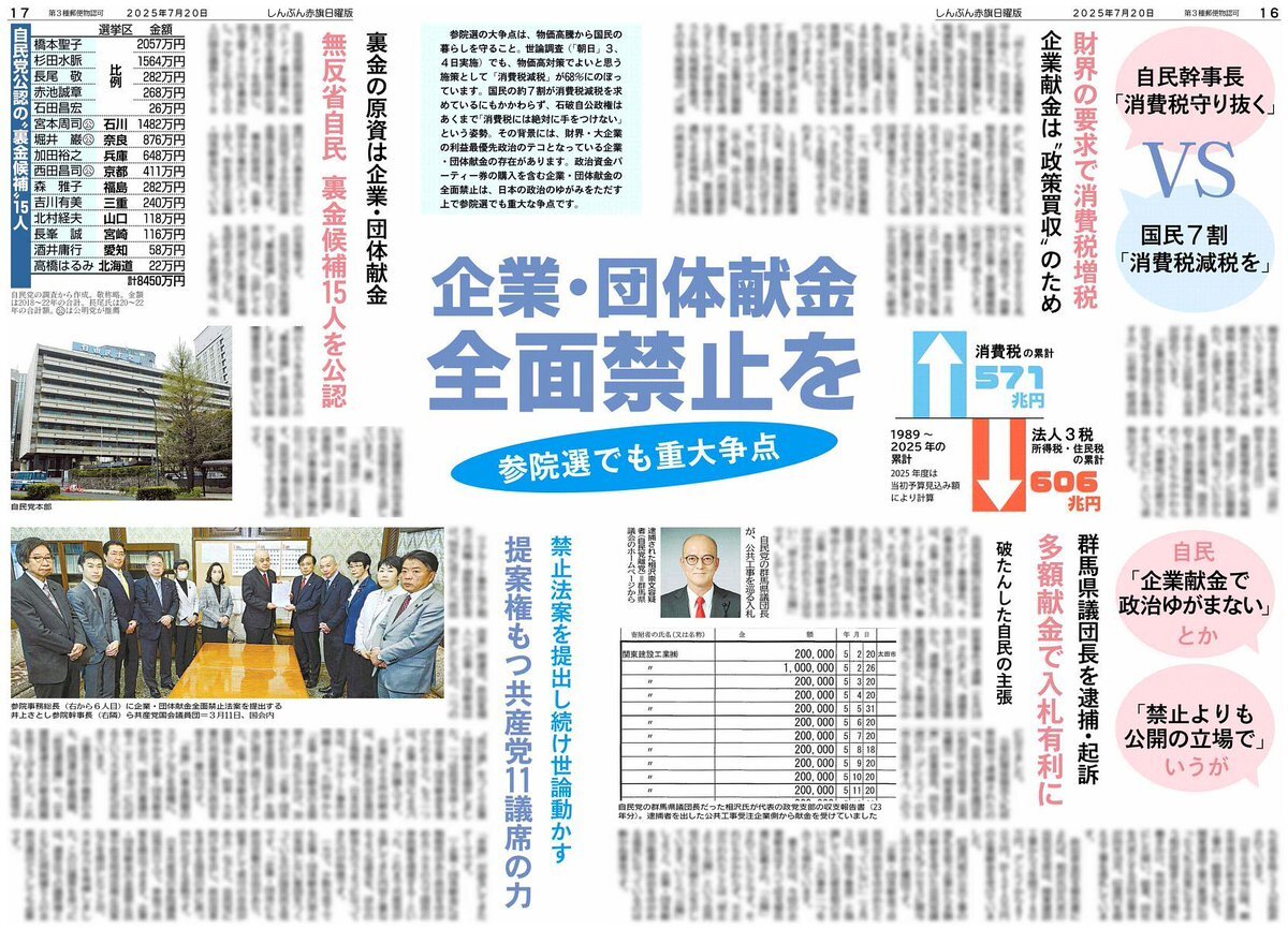 #赤旗日曜版 #7月20日号 財界からの巨額献金と消費税増税・法人税減税、公共工事受注企業側から自民党議員への献金、自民党の裏金事件…。パーティー券購入を含む #企業・団体献金 の全面禁止は、参院選の重大争点の一つ。財界・大企業の利益最優先政治のテコとなっている企業・団体献金を特集します。 pic.x.com/tGw04x1i1P