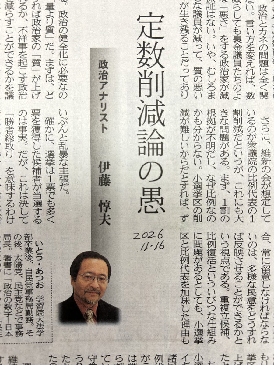 政治アナリスト伊藤淳夫さんが「定数削減論の愚」と題して、次のように論評しています。一つの意見として受け止めますが…? 「有権者に『受ける』との思いがあるのだろうが、そろそろ『削減ごっこ』はやめにしたらどうか。」 #定数削減 #削減ごっこ #企業・団体献金 pic.x.com/NDIbxq2DmB