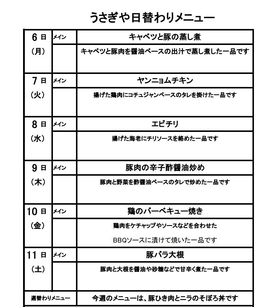 本日もお疲れさまですうさぎやです🐰🌞🍀 今週の日替わりメニュー表を~! ズサーッc⌒っ゚Д゚)っ🍱💡 今週もよろしくお願いいたします🙇🍱✨ #お弁当 #仕出し弁当 #企業公式がお疲れ様を言い合う pic.x.com/szpznnW0aR