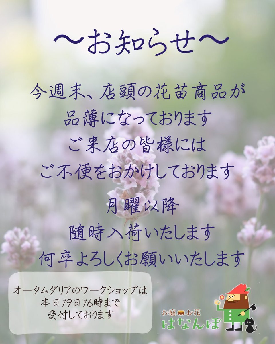 村松は☁️ 現在都合により、店頭の花苗が品薄になっております。ご来店いただきました方へご迷惑をおかけしております💦 明日以降にまた続々入荷しますので、よろしくお願いいたします🙇‍♀️(ダリアのワークショップは受付しております) #企業公式が毎朝地元の天気を言い合う #はなんぼははなやだよ pic.x.com/uJLn4T4lDC