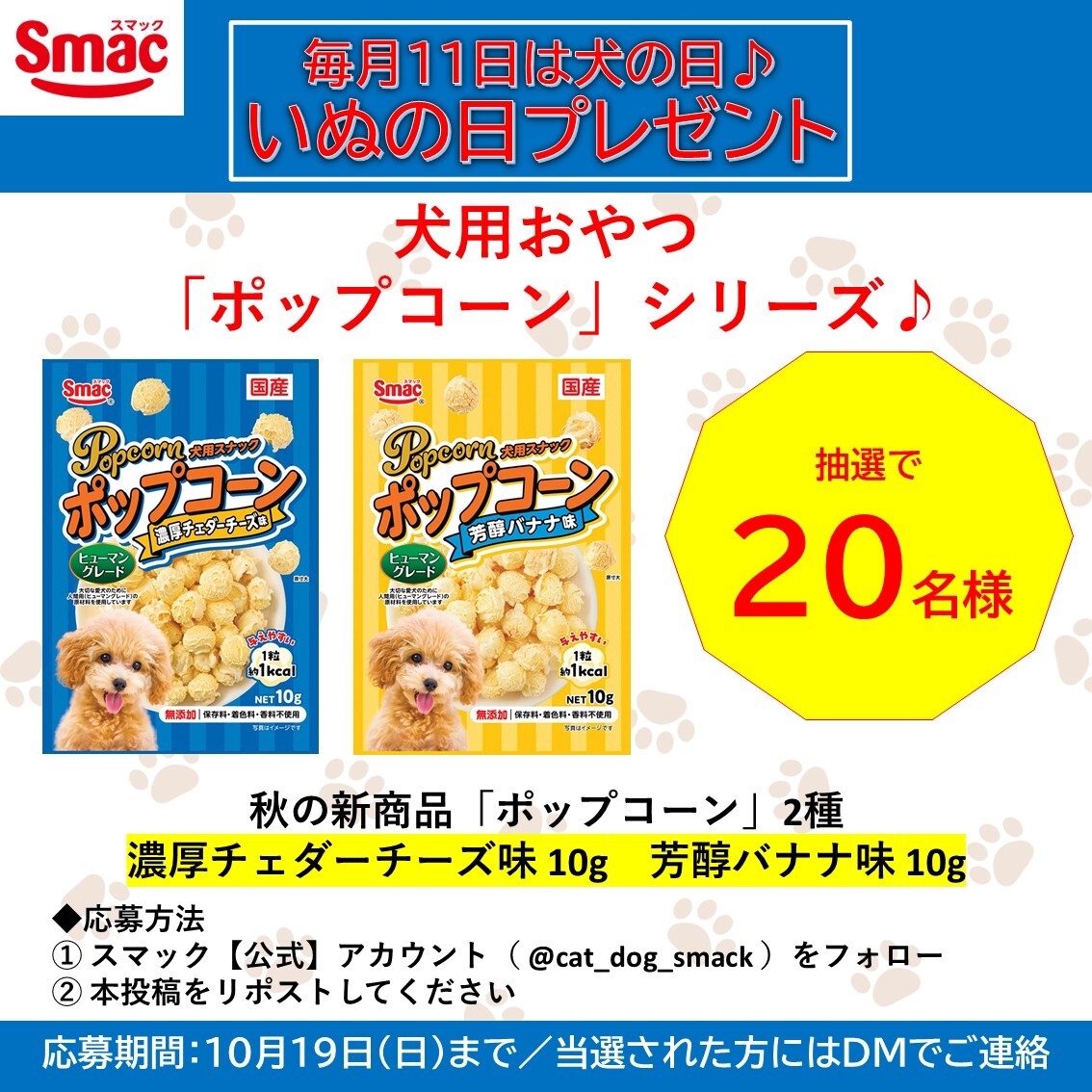 / 毎月11日はいぬの日プレゼント🐶 \ 今月は秋の新商品♪ 『ポップコーン10g』2種 濃厚チェダーチーズ味10g&芳醇バナナ味10g を20名様に🎁 大切な愛犬のために全て食品用(ヒューマングレード)の原材料を使用 油を使用しない、ヘルシーなエアポップ製法なので1粒が約1kcal♪ ■応募方法