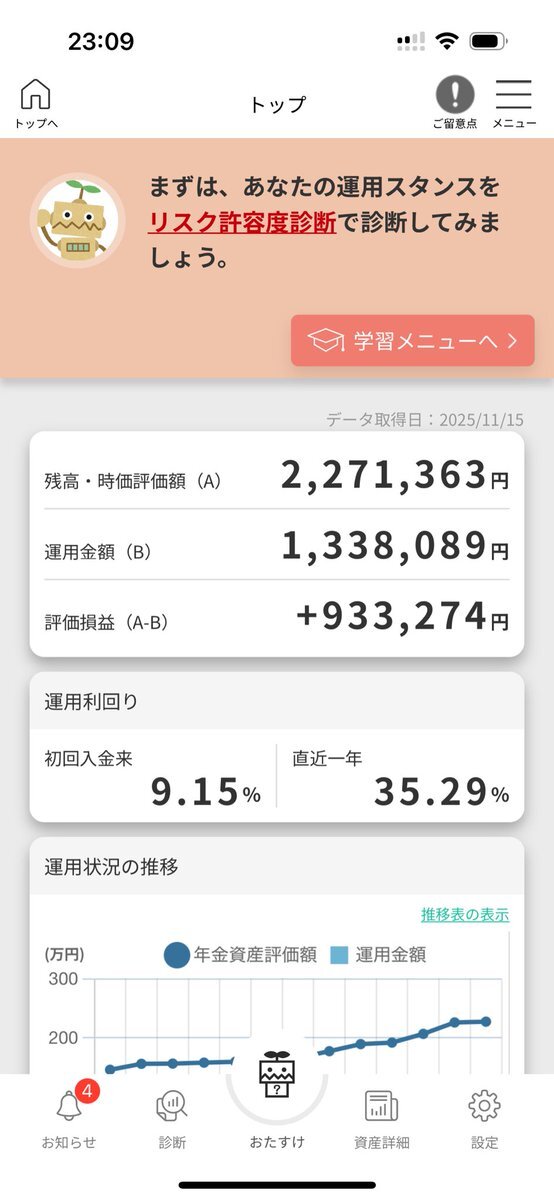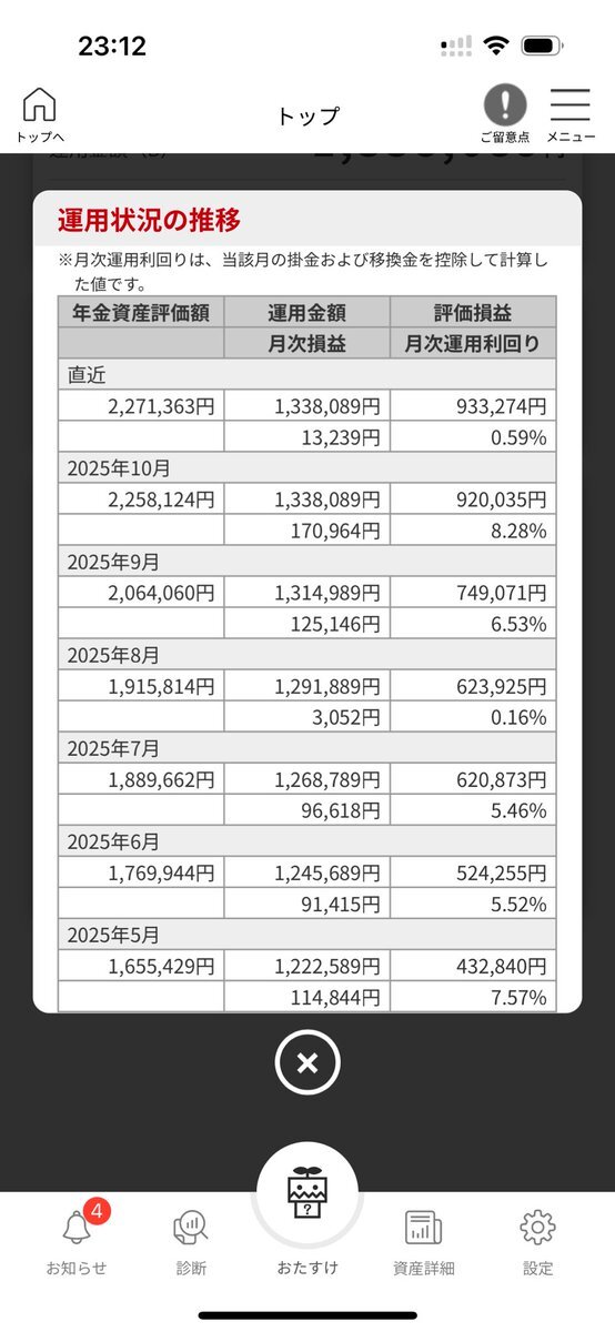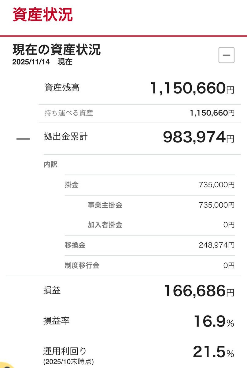 2025年から毎月5.5万拠出 保険等級が2等級下がって、社会保険料も削減 2025年10月 資産残高1,055,470円 (先月に対し+88,273円) 損益率13.6% 運用利回り16% いいですね。スクスク育ってます #企業型確定拠出年金 #リツアンSTC x.com/heechan_coffee…