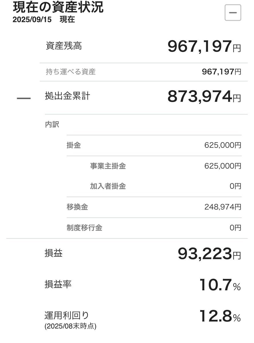 2025年から毎月5.5万拠出 保険等級が2等級下がって、社会保険料も削減 2025年9月 資産残高967197円 損益率10.7% 運用利回り12.8% #企業型確定拠出年金 #リツアンSTC x.com/heechan_coffee…