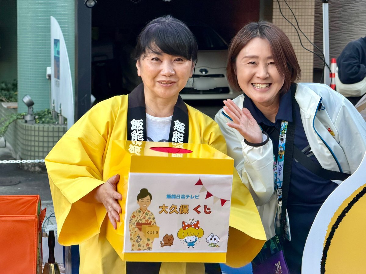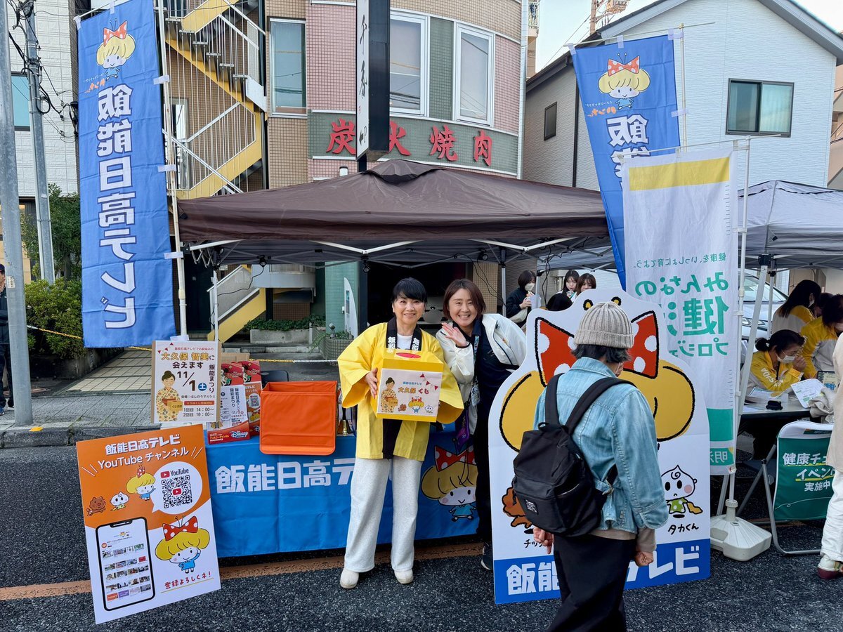 飯能日高テレビのブースも発見👀❗️ 美女のお二人が、カメラ目線してくださいました📸🤭 大久保智美さんの手には『大久保くじ』が😆 何が当たるかはお楽しみに〜✨ #scatmct #伊田淳 #飯能まつり x.com/scat_ida/statu…
