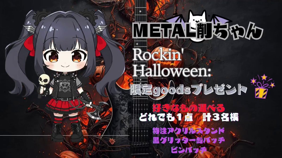 🎃#HappyHalloween 🎃 #METAL削ちゃん 限定Goods発表🎊 👻特注アクリルスタンド 👻黒グリッター缶バッチ 👻ピンバッチ お好きなもの選べる ハッピーハロウィン #キャンペーン プレゼント🎁 計3名様✨ キャラ初のRockテイストの削ちゃんと 一緒にシャウトしよう⚡️🎤 ミュージック付き限定動画を x.com/d1kongo/status…