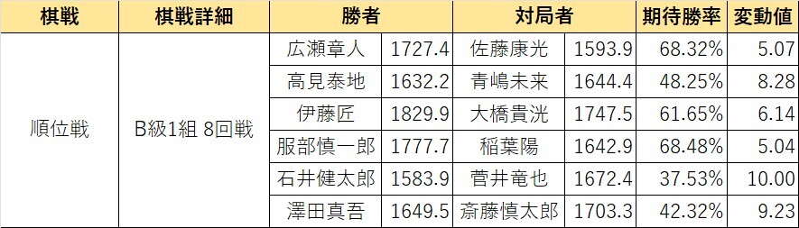 #順位戦 B級1組 8回戦 1敗同士の直接対決は #伊藤匠 二冠に軍配。 #広瀬章人 九段も1敗キープです。 7-1 ⑬伊藤匠 6-1 ⑤広瀬 6-2 ⑪服部 5-2 ④大橋 4-3 ③澤田 4-4 ⑥斎藤慎 3-4 ⑧大石 3-5 ①菅井 ⑫青嶋 2-5 ②稲葉 ⑦佐藤康 ⑩高見 1-6 ⑨石井 pic.x.com/wGCtflv3zj