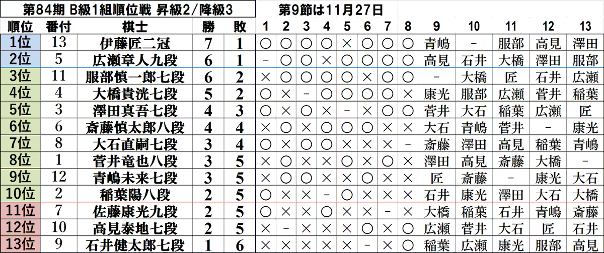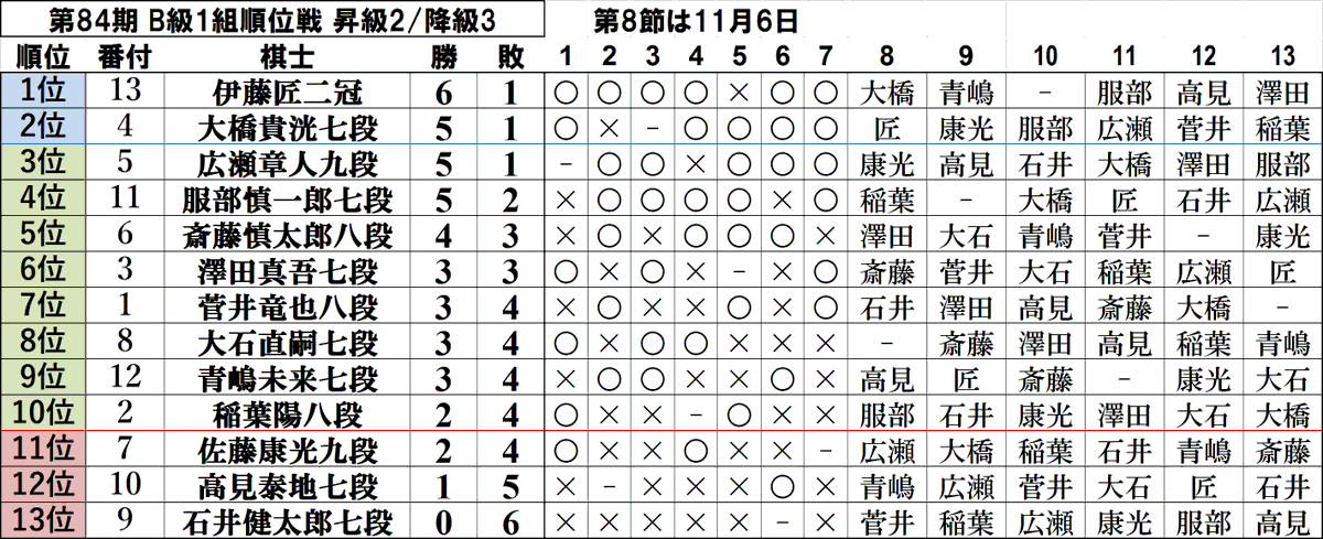 #将棋 #順位戦 #B級1組 第8節終了 #C級2組 は第6節後半戦終了後に更新 #菅井竜也 八段と #稲葉陽 八段の降級組は 伸び悩んでいる。#佐藤康光 九段も降級圏内。 #高見泰地 七段と #石井健太郎 七段は勝って 怒涛の逆転を狙う!#伊藤匠 二冠が首位を守る! B級1組は3週間後に次を迎えますよ! pic.x.com/djb2qy5VwP