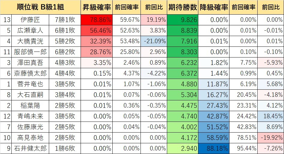 #順位戦 B級1組 8回戦終了 確率分析 昇級争いは #伊藤匠 二冠が1敗の直接対決を制し 確率単独トップに踊り出ました。 同じく1敗を維持の #広瀬章人 九段が2位で続きます。 残留争いは #石井健太郎 七段が初白星、 #高見泰地 七段が2勝目で一気に混沌化。 依然厳しい確率も残留が見えてきました。 pic.x.com/Fux8PtHzwX