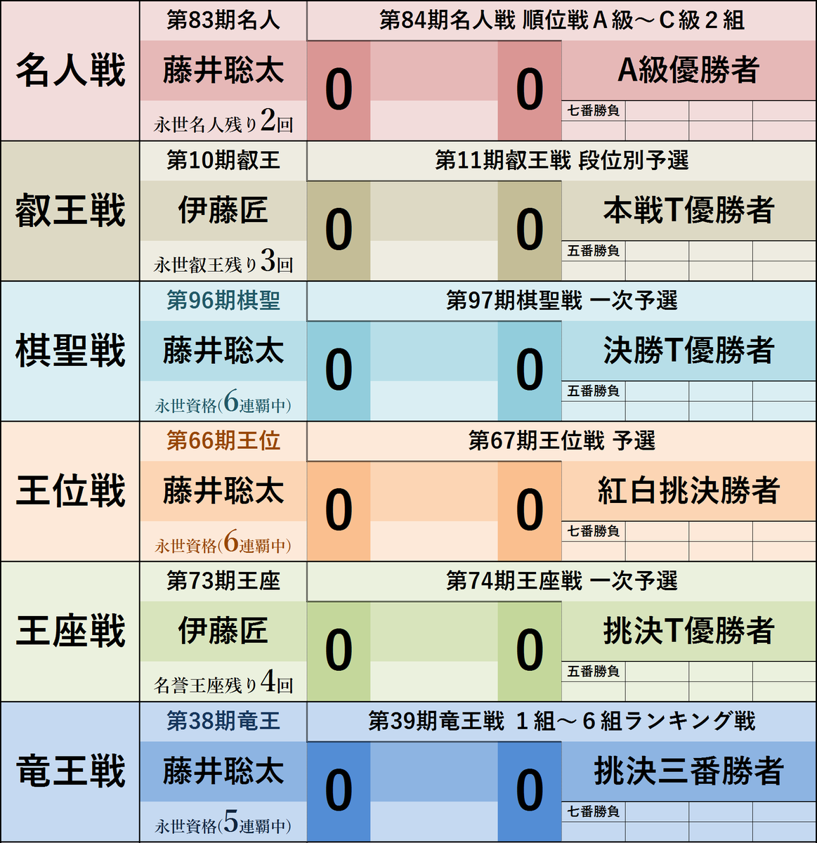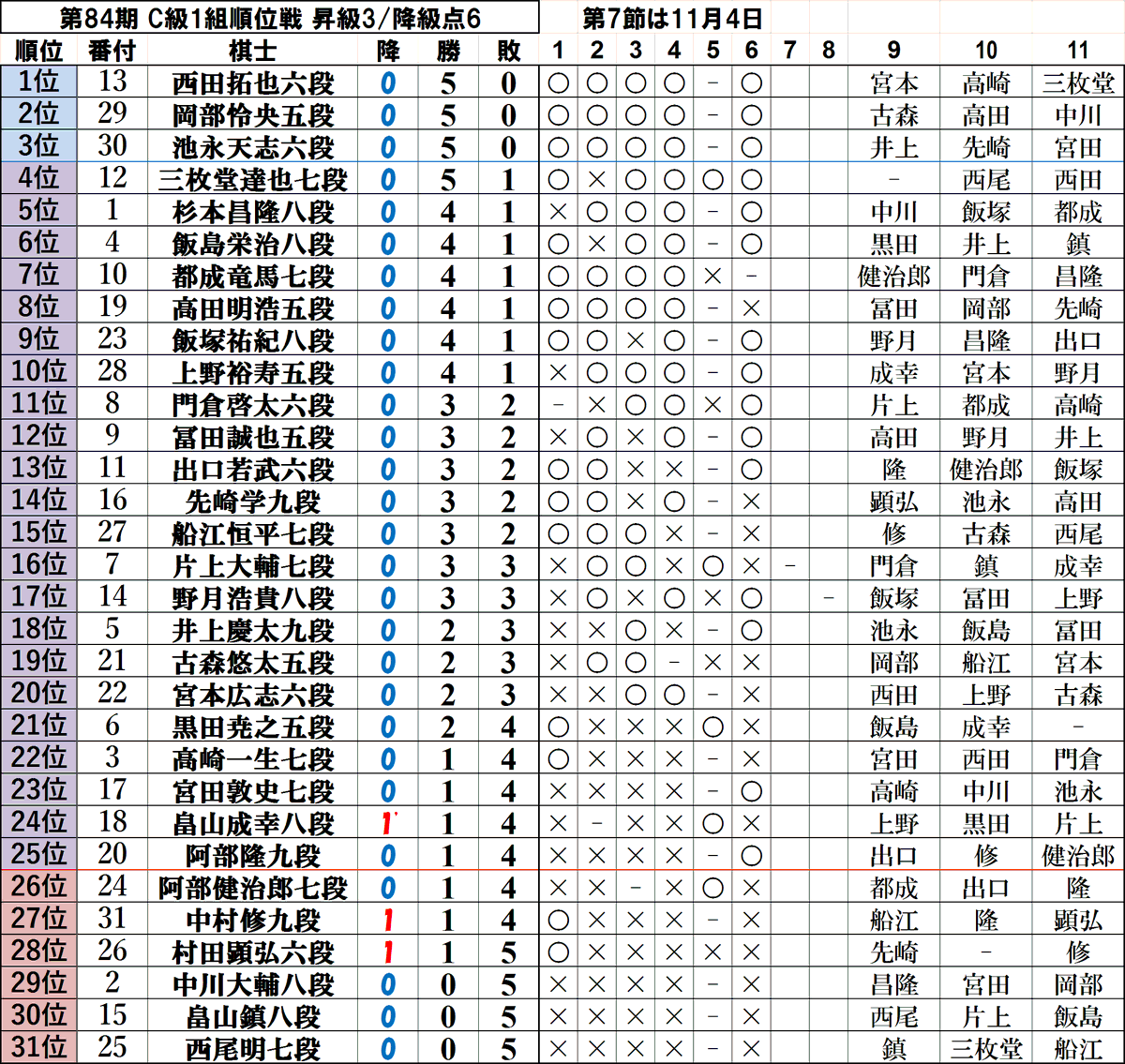 #将棋 #順位戦 #C級2組 は4枚目 #遠山雄亮 六段、#田中悠一 六段 あと2勝で降級点が1つ消去! #上村亘 五段 次敗れると5勝による降級点消去権が消滅! #佐々木大地 七段、#八代弥 八段 今度こそ…? #B級1組 1枚目 #伊藤匠 二冠に変更済 #B級2組 (2枚目)、#C級1組 (3枚目) 。 pic.x.com/nPaV45j4X2