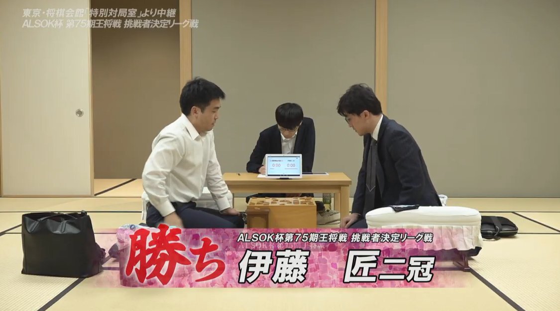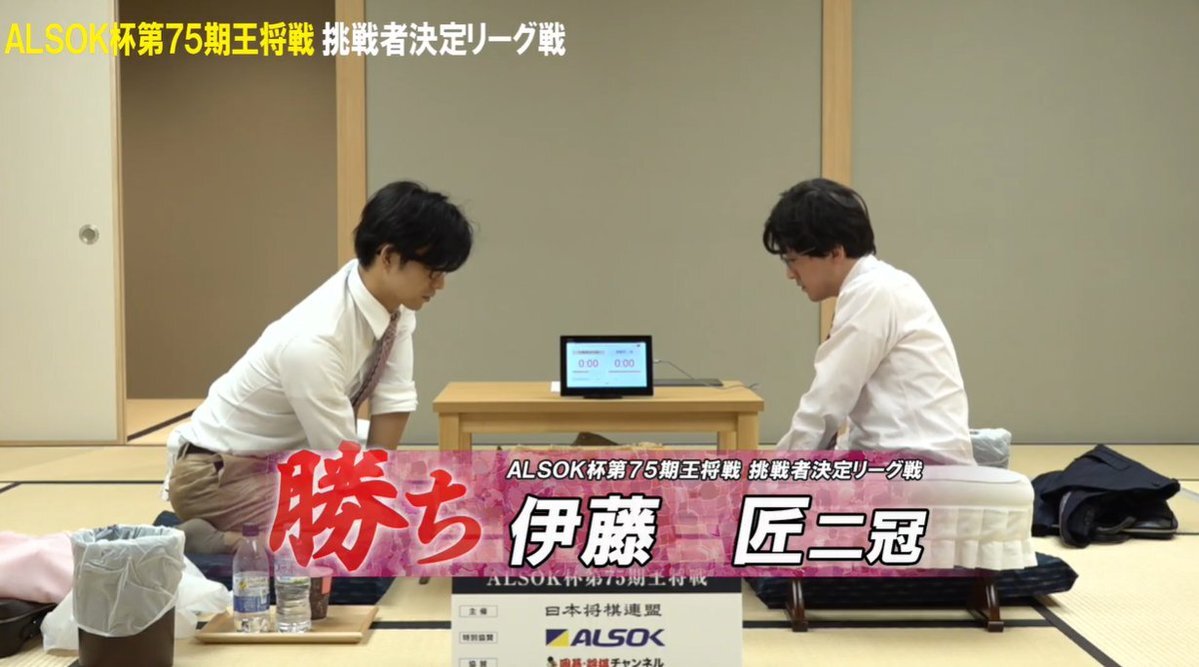 ◥◣対局終了◢◤ ALSOK杯 第75期 #王将戦 挑戦者決定リーグ戦 #伊藤匠 二冠 vs #大橋貴洸 七段 108手にて伊藤匠二冠が勝利しました。 ▼アーカイブはこちら 🔗youtube.com/live/HwlkF3sV0… 次回の #王将リーグ は 11/4(木)「#佐々木勇気 八段vs #近藤誠也 八段」戦をお届けします。 pic.x.com/QcGyer9bbY