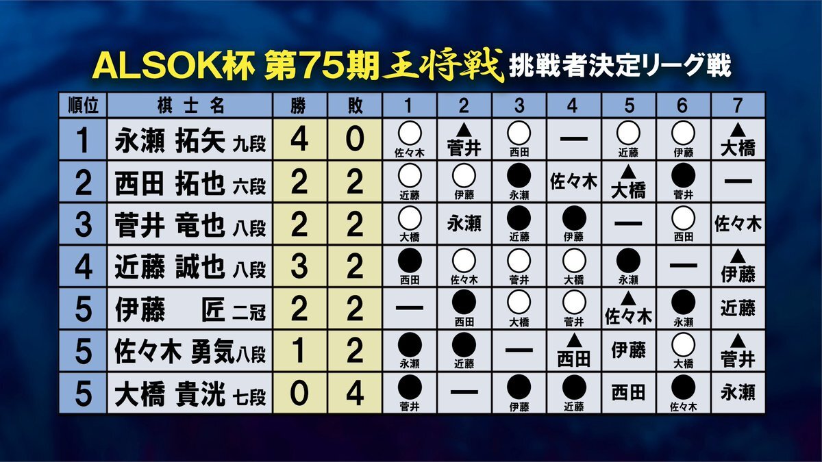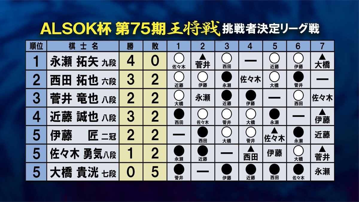 ◥◣王将リーグ👑現時点の戦績◢◤ ALSOK杯 第75期 #王将戦 挑戦者決定リーグ戦 が進行中🔥 11/11(火)対局終了時点のリーグ戦績はこちら📝 ▼これまでの対局はここからご覧になれます✅ youtube.com/playlist?list=… 次週からは王将リーグも佳境を迎えます‼ 11/17(月) #伊藤匠 二冠 vs #佐々木勇気 pic.x.com/LaNsA9p0su