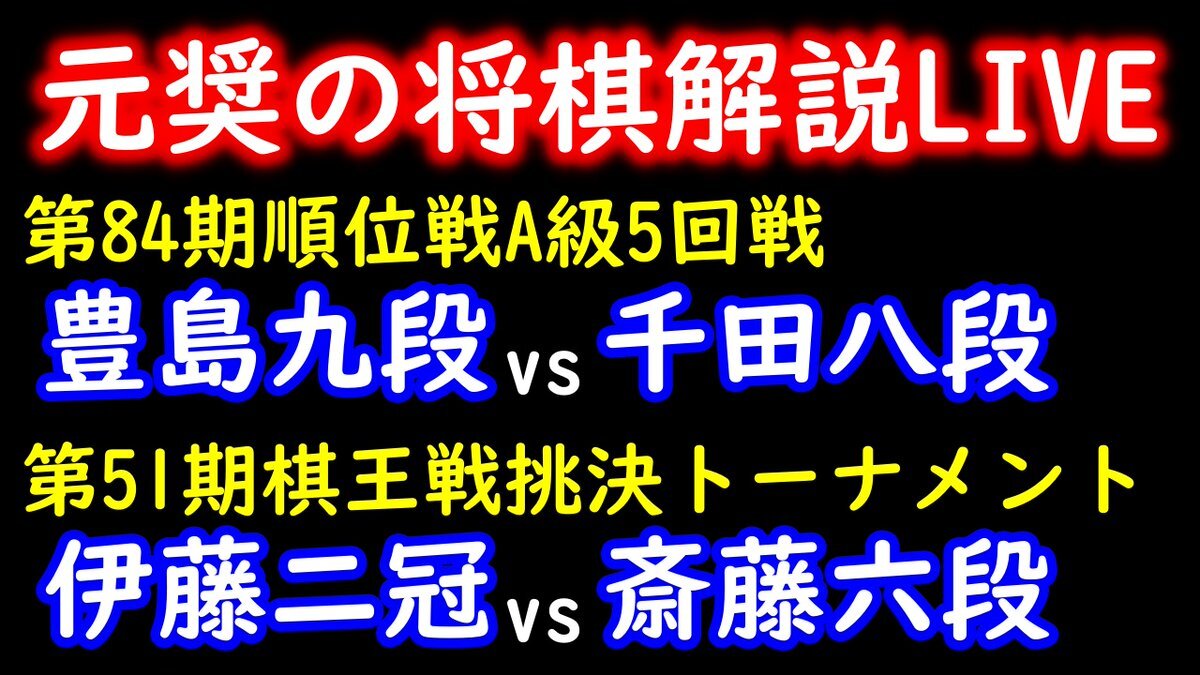 11月14日(金)10:00~ ☗第84期順位戦A級5回戦 豊島将之九段 vs 千田翔太八段 ☗第51期棋王戦挑戦者決定トーナメント 伊藤匠二冠 vs 斎藤明日斗六段 youtube.com/live/-uOyovozK… #将棋 #伊藤匠 pic.x.com/tby7Ph7Jut