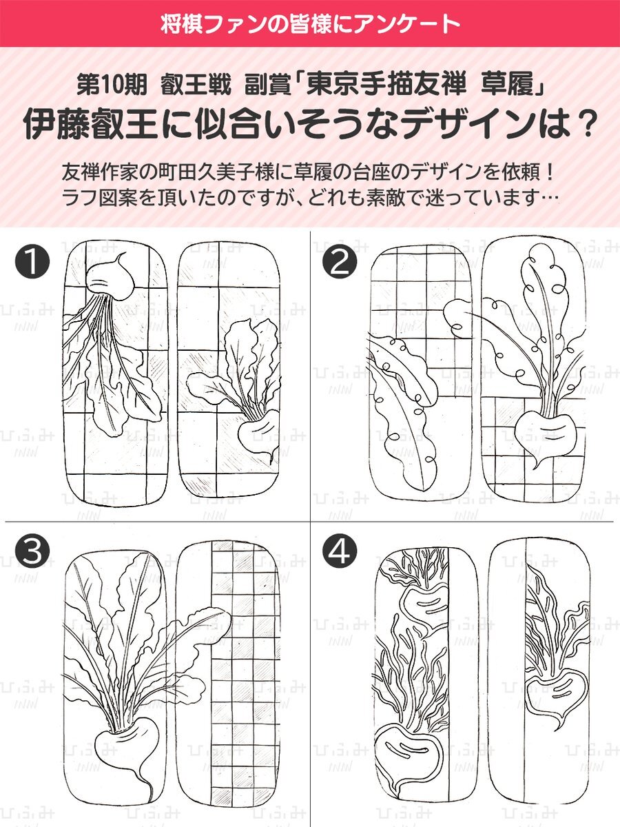 \あなたの1票で伊藤叡王の草履デザインが決まる!?/ ひふみでは第10期叡王戦で防衛を果たした伊藤叡王への副賞として「東京手描友禅 草履」を贈呈予定です! デザインは第5局が開催された柏市の特産品「小かぶ」をモチーフに制作🥬 3日間限定のアンケートでお気に入りデザインに投票してください👇