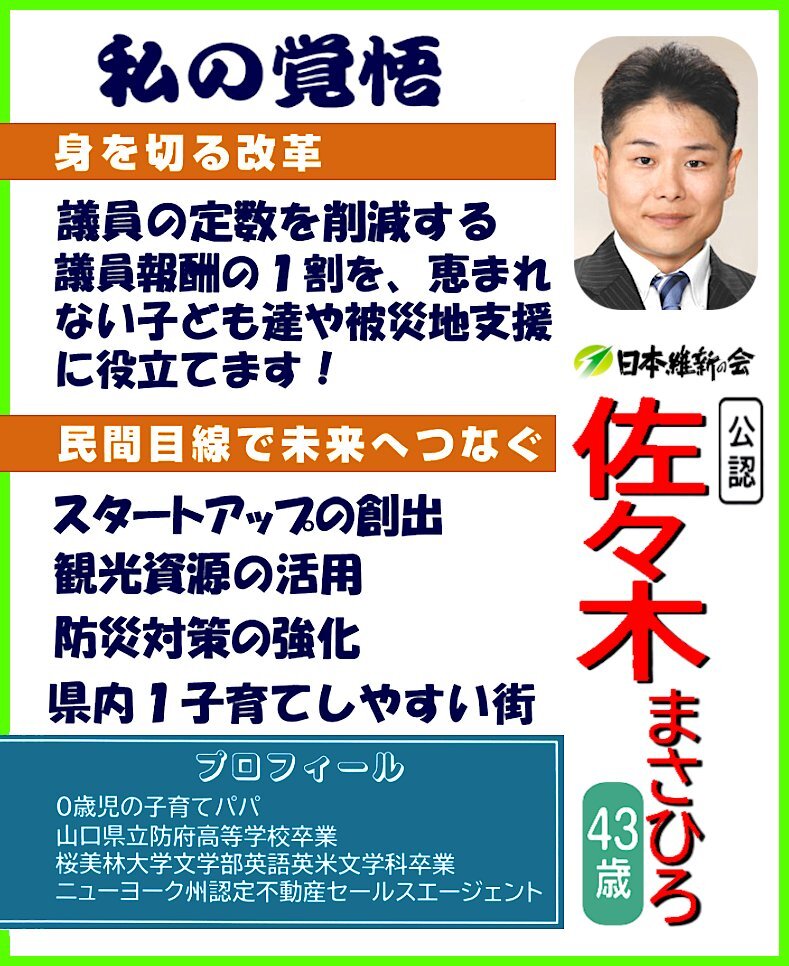 山陽小野田市議会議員選挙 10/5(日)投開票   日本維新の会公認【 佐々木 まさひろ 】   期日前投票に行こう👫 投票所と日時(画像参照)   #山陽小野田市 #山陽小野田市議選 #佐々木まさひろ #日本維新の会