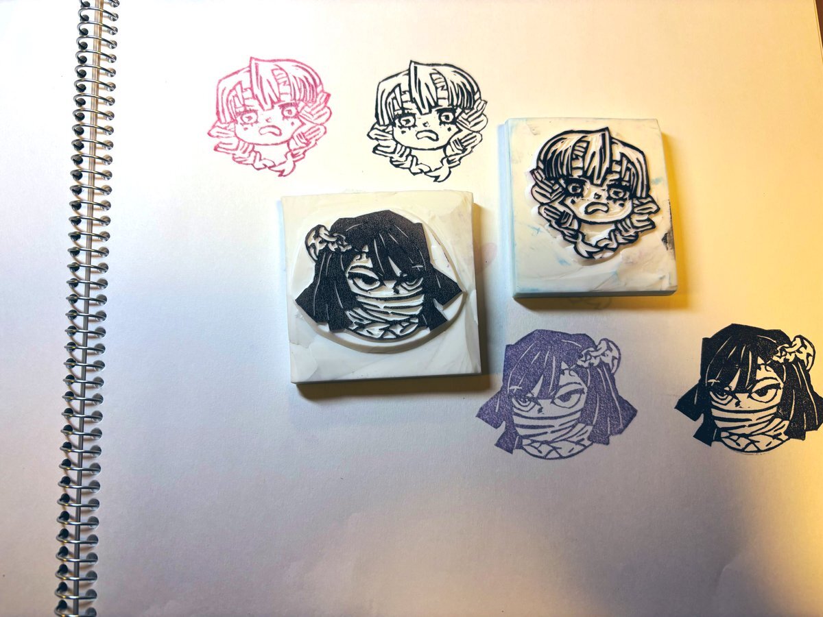 👹FB1はんこシリーズ化してきています このまま全柱掘ってしまうか?! 口ポカン蜜璃ちゃんとギロ目伊黒さん。 #消しゴムはんこ #鬼滅の刃 #甘露寺蜜璃 #伊黒小芭内 pic.x.com/ZjKb00Suah