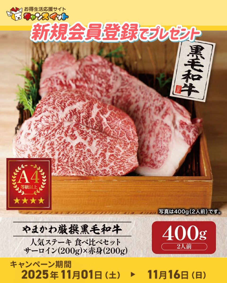 提供:インフォニア株式会社 新規会員登録で黒毛和牛【ステーキ】をプレゼント! 期間:2025/11/1~11/16 賞品:黒毛和牛【ステーキ】人気部位セットサーロイン(200g)×赤身(200g)×3名様 応募はこちら→ chance.com/go.srv?id=46116 #チャンスイット会員登録CP #会員登録 #懸賞 #チャンスイット
